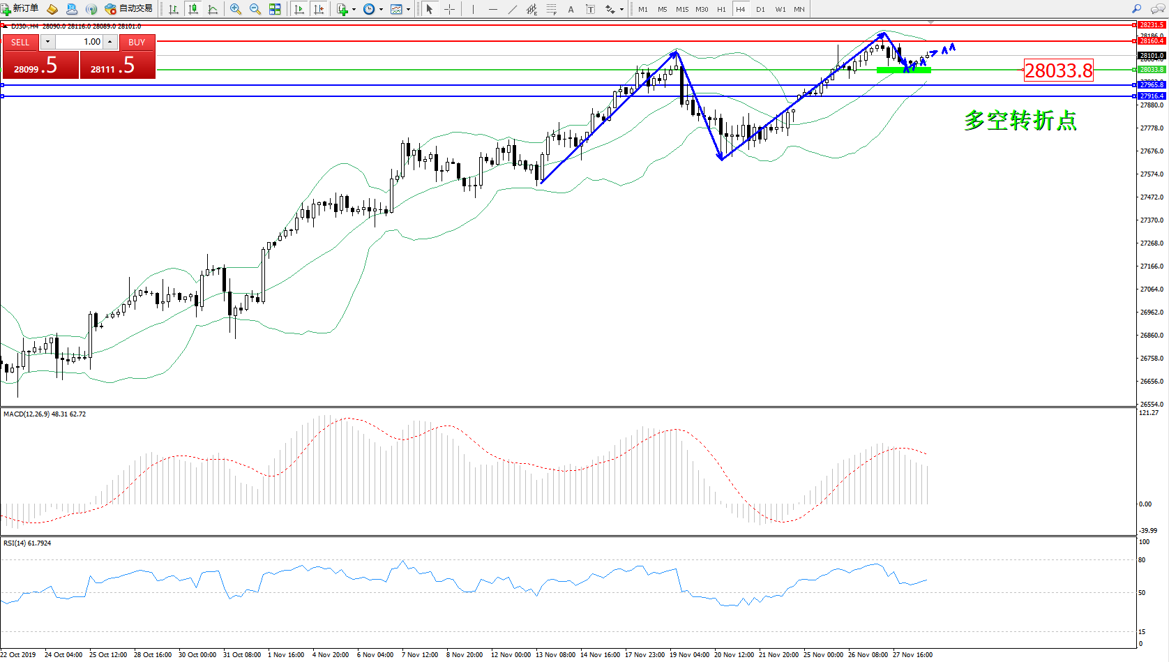 纽约证券交易所周四(1128日)休市一天,纽约证券交易所提前于北京时间周六(1130日)2:00休市,道琼斯指数1127日(周三)收盘上涨42.30点,涨幅0.15%,报28164.00点。美国经济增长第三季略有提速,第三季度GDP的年化增长率为2.1%,好于最初报告的1.9%和上一季度的2%;而不是像最初数据显示的那样放缓。这让市场确信,尽管人们担心旷日持久的贸易争端会带来影响,但全球最大经济体美国经济体质依然稳健。市场信心高涨,美联储短期内不会进一步放松货币政策,美联储主席鲍威尔周一称,货币政策“处于良好位置”,以支持强劲的就业市场。