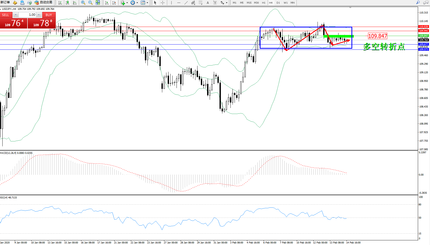 交易策略:109.847下方看跌,目标109.677、109.573