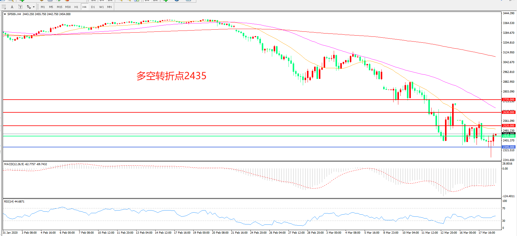 4小时图看,标普500维持低位震荡,整体走势十分低迷,均线系统呈空头排列,MACD绿柱增加,RSI指标走平,日内震荡下行较大。