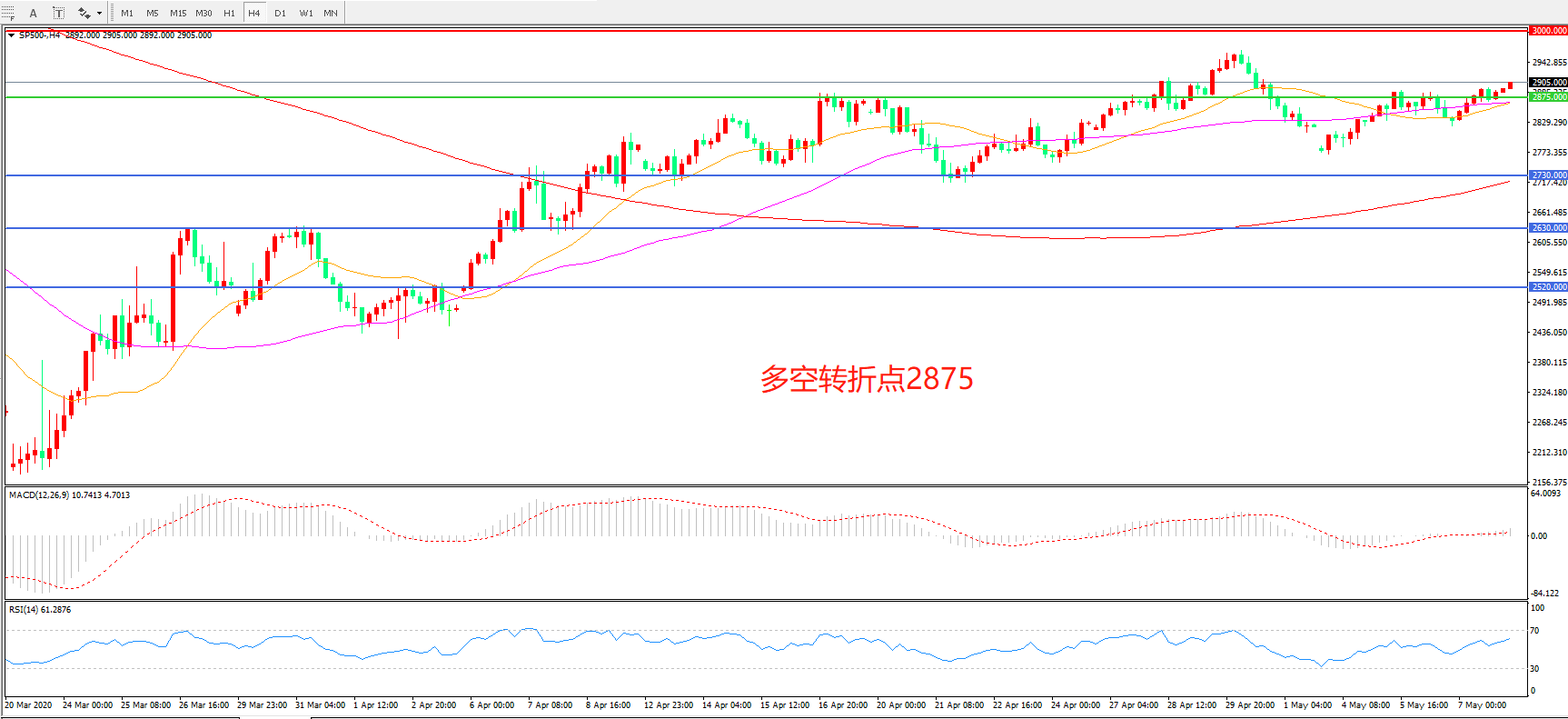 4小时图看,标普500震荡反弹,短期走势回暖,2875一线被突破,均线系统走平,成为下方支撑,MACD红柱加,RSI指标走平,日内延续震荡概率较大。