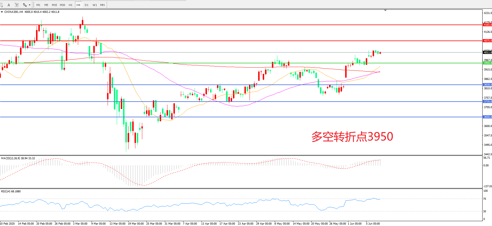 4小时图看,沪深300延续高位震荡,整体表现较为平稳,低点逐渐抬高,均线系统有拐头迹象,MACD红柱增加,RSI指标走平,日内延续上行概率较大。