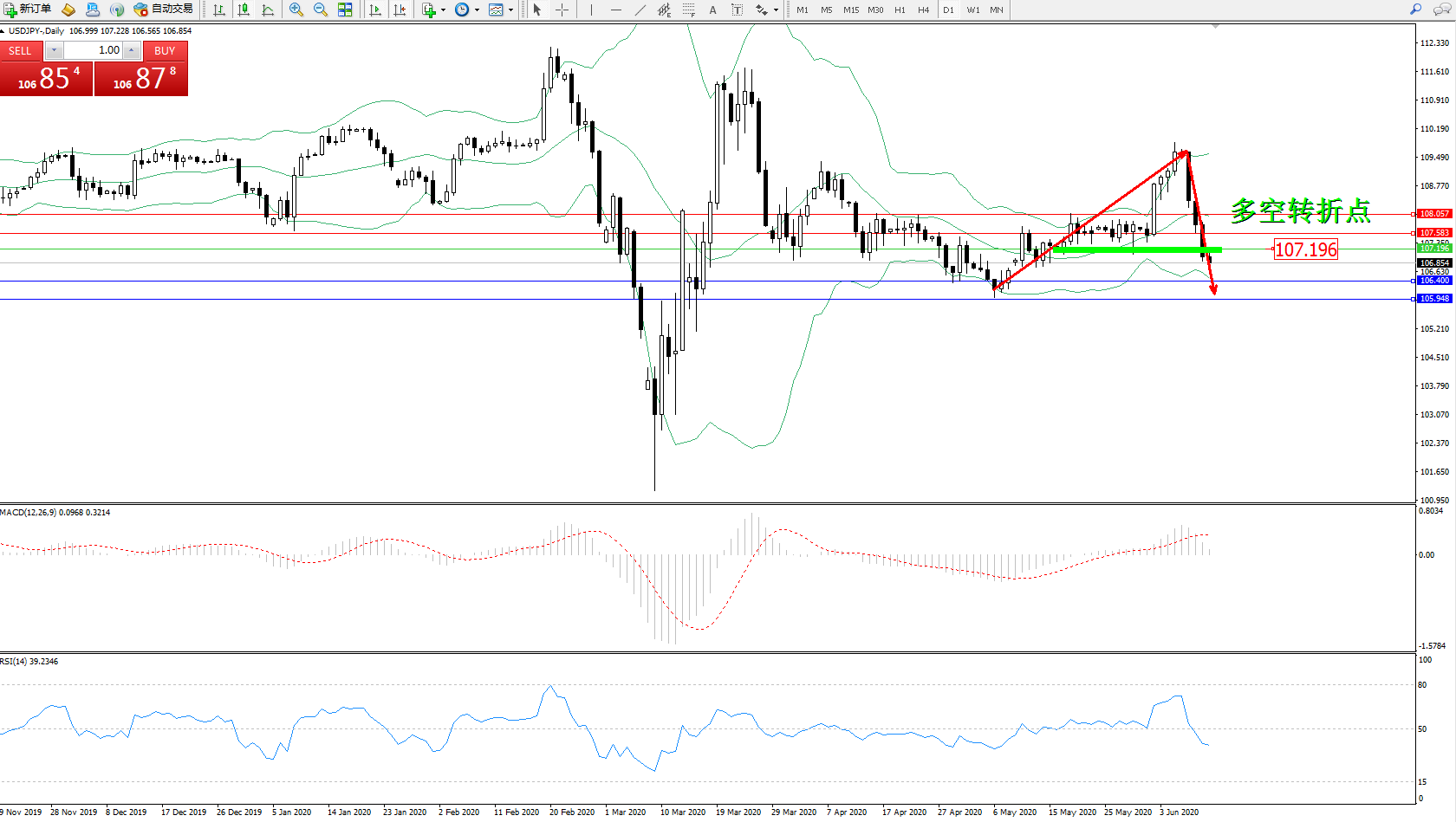 技术点评:空头动力高位急速重挫下行至布林带指标下轨附近得到短期支撑,开始维持震荡走势,空头动力强劲且未有最终止步迹象,布林带指标呈张口走势持续后有收口迹象,MACD指标处于多头动力持续震荡回撤至0轴线附近徘徊,RSI指标空头动力持续高位重挫下破50均衡线进入空头区域弱势下行中;