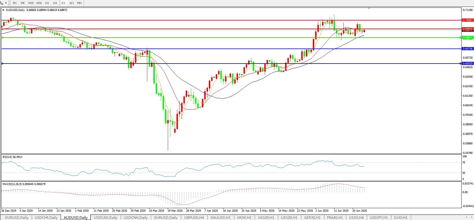 交易策略:0.6800上方看涨,目标0.6900、0.7000