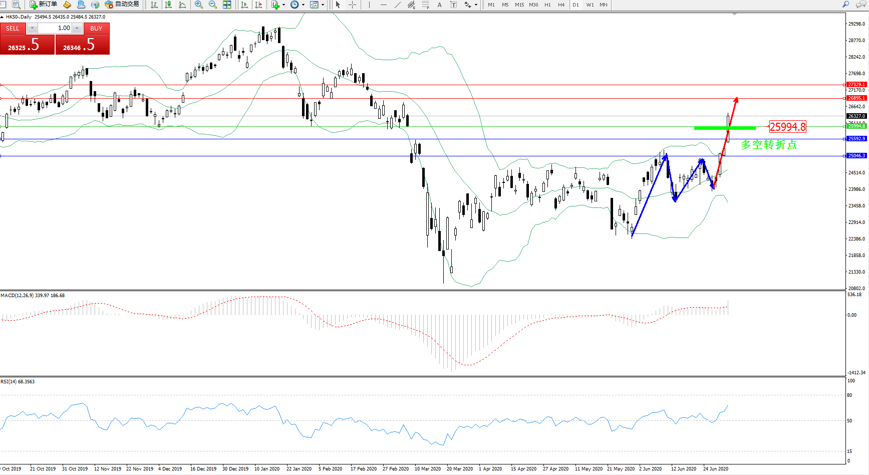 香港恒生指数7月6日(周一)收盘上涨966.04点,涨幅3.81%,报26339.16点;自3月收盘低点涨逾20%。港股做多情绪十分高涨,三大指数均大幅上涨。国指涨4.72%报10726点。红筹指数涨6.3%报4321点。念叨了几天的年线今天终于顺利突破,成交量也放出了近期的天量。南下资金大幅流入111.87亿港元,大市成交额放大至2507亿港元。中资券商股与半导体表现十分亮眼,中芯国际暴涨超20%续创新高,“回A”公布后已累涨170%,前期强势的生物医药股下跌明显,软件股亦走低。恒指今天突破了年线,其意义重大,这是属于标志性的突破。后市的走势会相对轻松。今天金融股属于全面高潮,预期差会愈来愈低,除非是消息面再度形成刺激。