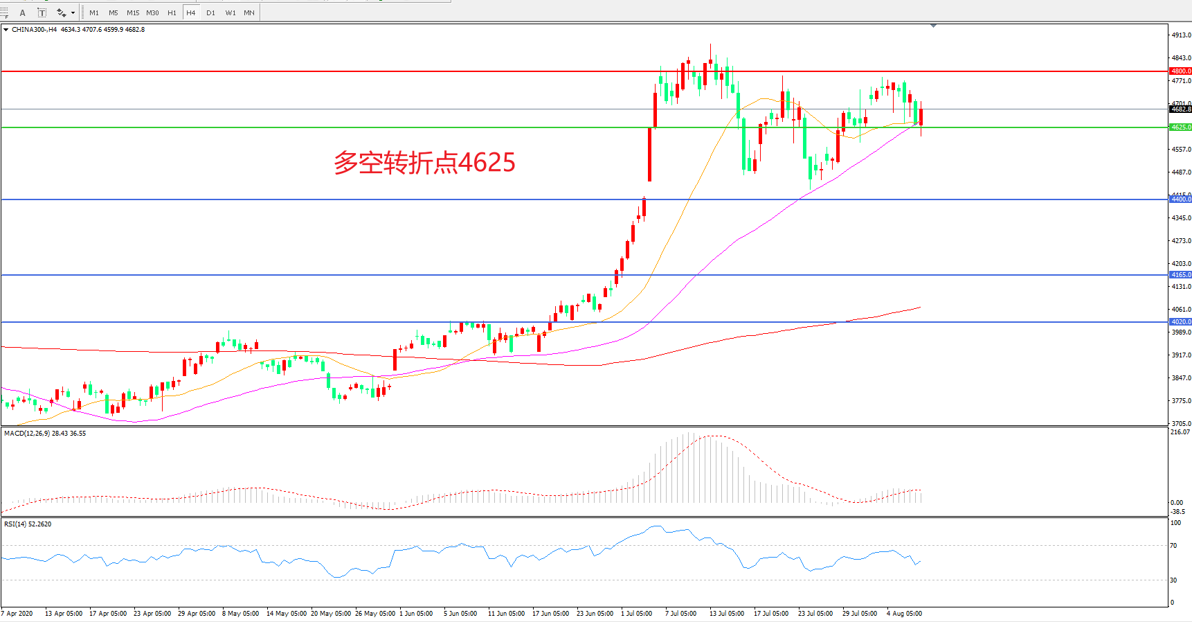 4小时图看,沪深300延续高位震荡,4625成为短期支撑, 均线系统逐渐粘合, MACD红柱缩短,RSI指标向上,日内延续上行概率较大。