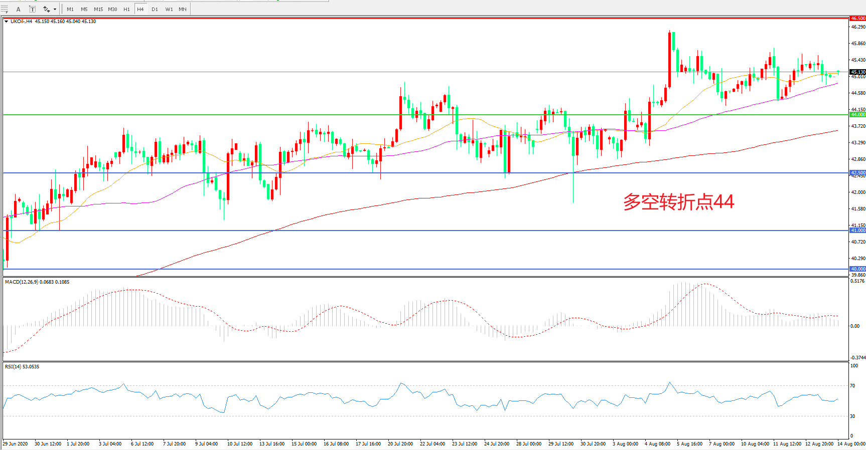周四(8月13日),基本面市场和宏观市场依然没有发生较大的变量,国际油市风平浪静,布伦特原油延续高位震荡,收报45.12美元/桶。随着近期原油需求温和复苏,布油始终维持在44美元上方,显示出明显的抗跌性。一旦近期在这个长周期均线确立支撑,或上探50美元关口。