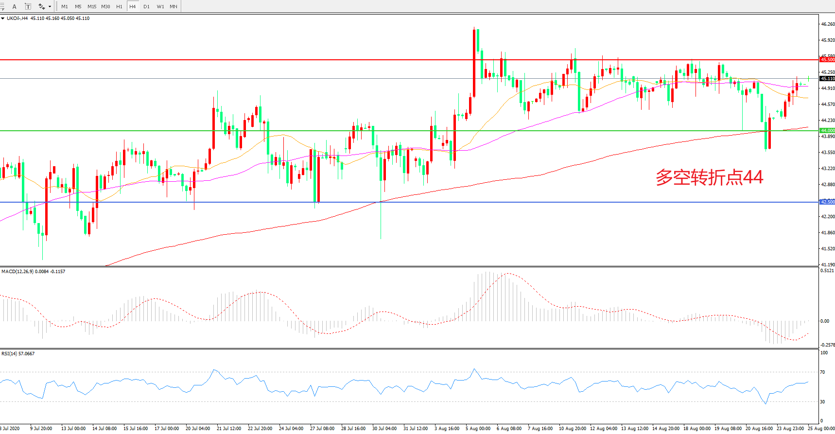 小时图看,油价阳线连续拉升,整体表现偏强,45.5美元成为短期支撑,均线系统出现拐头,MACD红柱增加,RSI指标走平,日内延续上行概率较大
