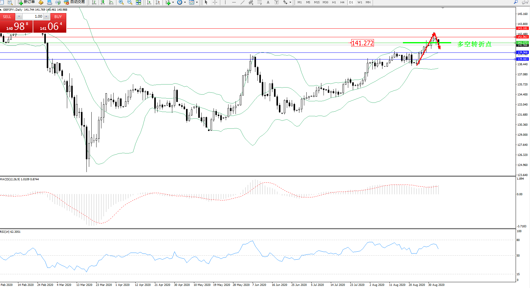 备选策略:141.272上方看涨,目标142.063、143.181