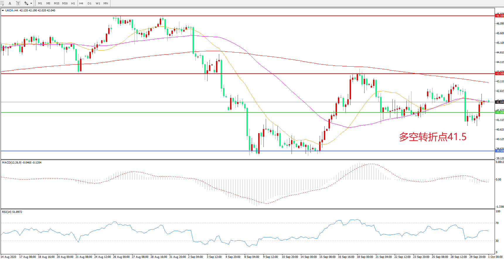 交易策略:   在41.50之上看涨,目标43.50      46.50