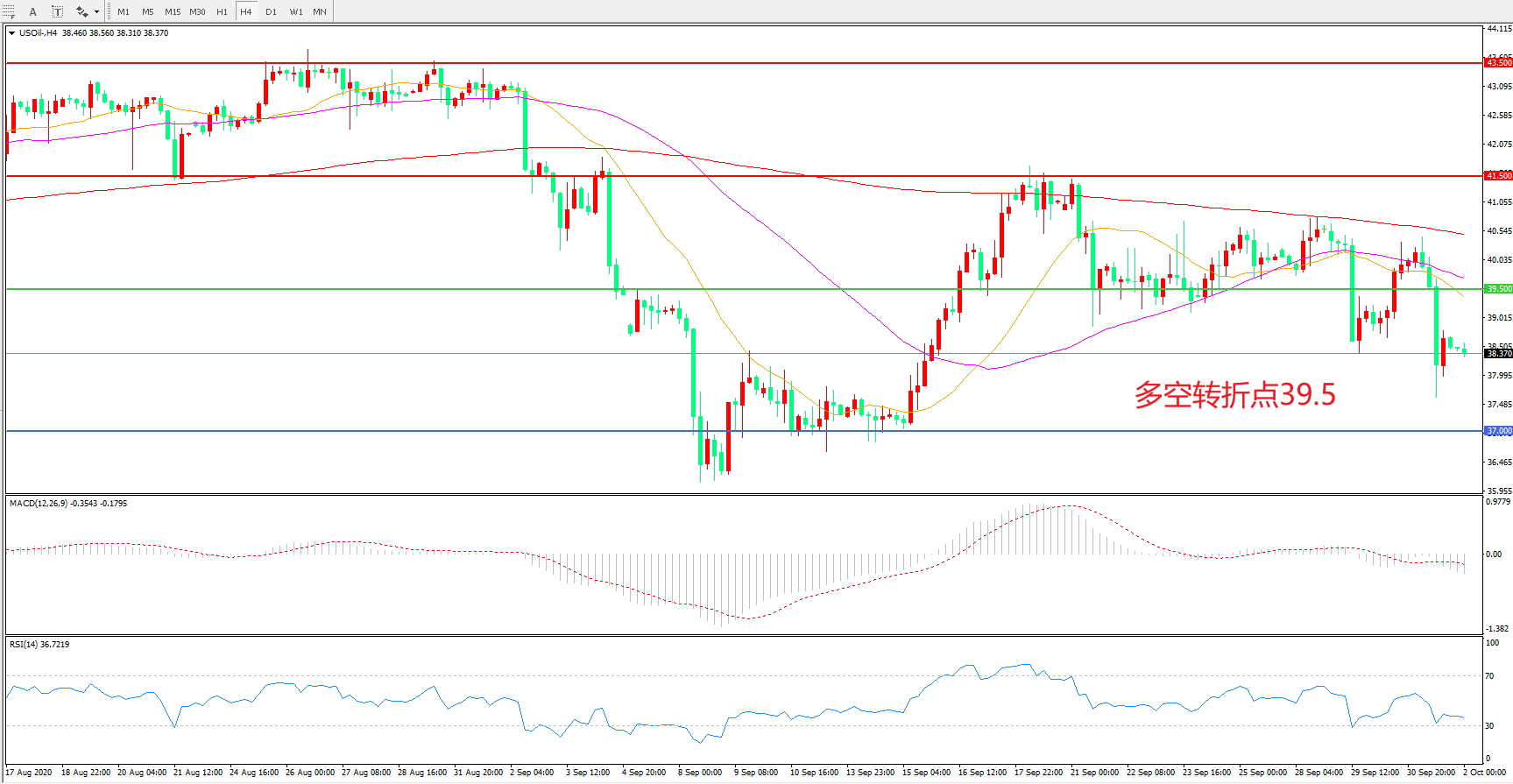 交易策略:在39.50之下看跌,目标37.00         35.00