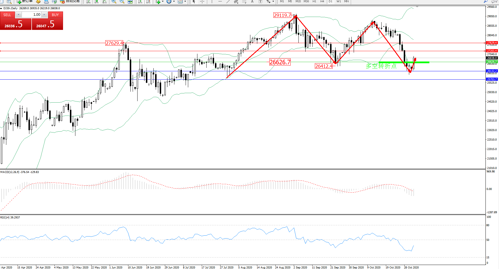 道琼斯指数11月2日(周一)收盘上涨423.50点,涨幅1.60%,报26925.05点。美股三大指数集体收涨,从上周创下的3月以来最大单周跌幅中反弹。在美国大选前一天,投资者押注能源、材料和工业板块。苹果和亚马逊令指数承压,因投资者从居家概念股转向可能受益于更多刺激措施的板块。大选前有很多总体性的仓位布置,投资者有点不安,而且还有其它一些不确定因素--新冠疫情,欧洲和美国中西部地区的情况,让投资者警惕这方面的不确定性仍可能主导市场。美元指数升至逾一个高位,主要货币的隐含波动率升至4月以来最高水平,因投资者对周二美国总统大选的结果感到不安。后随股市上涨而削减涨幅。随着风险情绪恶化,美元在过去一周走强,投资者因大选结果的不确定性而减少仓位。民主党候选人拜登在全国民意调查中领先特朗普,但二人在关键州的竞选看起来势均力敌,特朗普仍可能在决定最后胜负的选举人团投票中取得获胜所需的270票。投资者对是否相信民调也犹豫不决,多数民调在2016年未能预测特朗普当选。