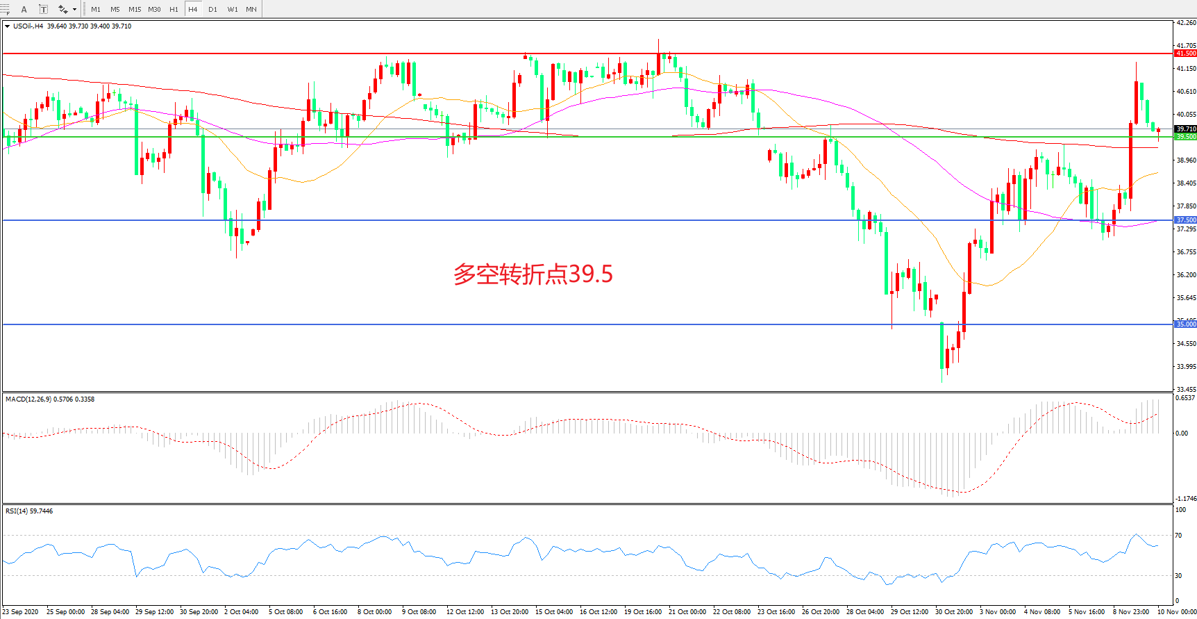 周一(11月9日),新冠疫苗突现重大利好,美国辉瑞制药和德国合作伙伴宣布,其新冠候选疫苗的第3期临床试验中期分析取得重大进展,疫苗有效率超过90%,WTI原油大涨超过10%,震荡回落后收报39.45美元/桶。
