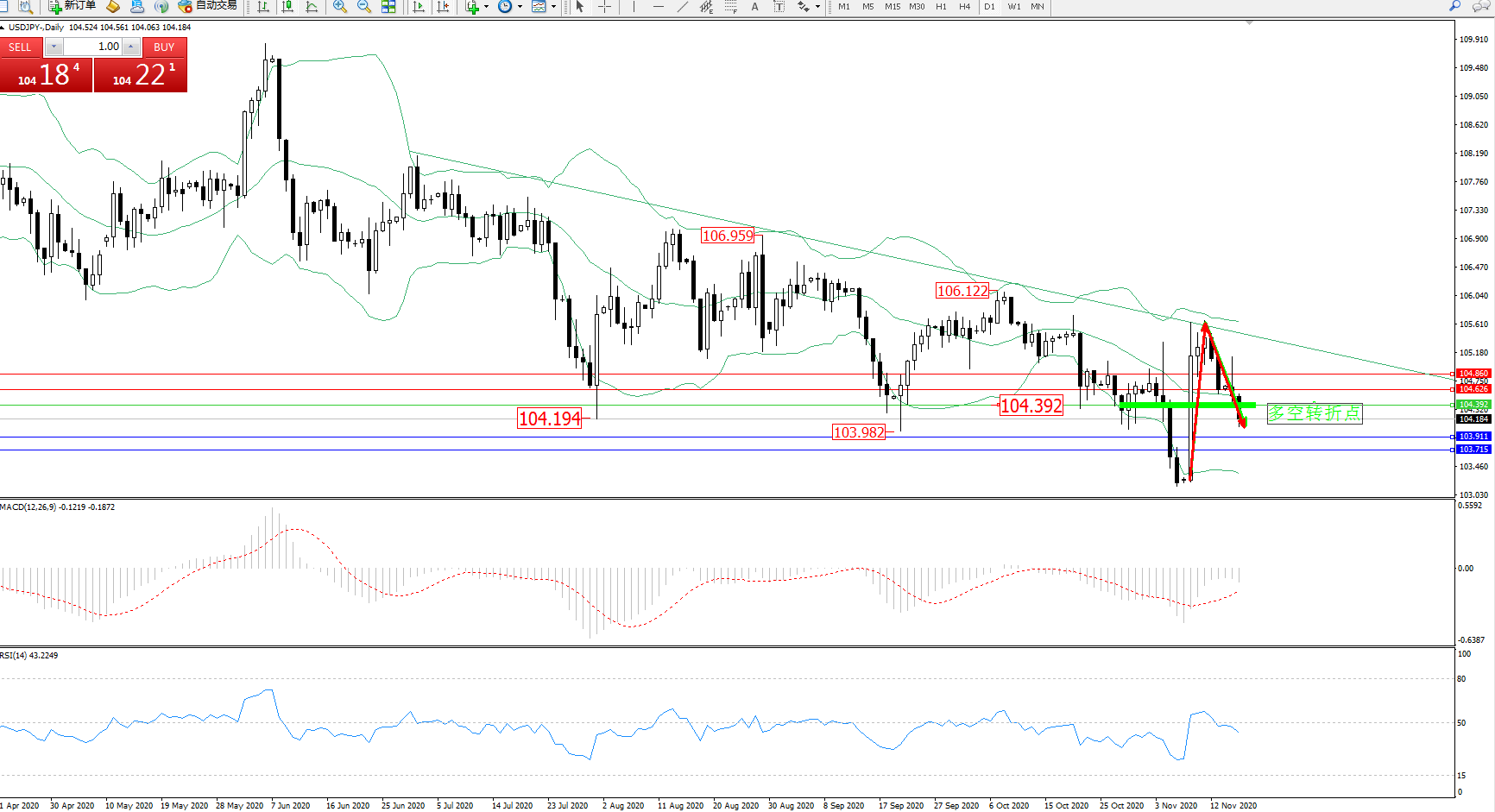 美元兑日圆持续下挫至至104.184附近震荡,呈跌至一周多低位104.063,再度逼近104心理关口,因隔夜疫苗研发利多消息在被市场彻底消化后,对美国政局僵局影响经济前景的顾虑进一步升温,令更多资金从北美市场撤离流向亚太市场,日内美国市场因此也再度上演了股汇双杀的局面,美元与美股股指期货在纽约市场开盘前同时承压。过随后疫苗利空消息被迅速消化,市场对避险日元仍然相当看好。稍早时候日本央行提出在未来直接买入1万亿日元,并提供美元基金集合抵押品。尽管日本三季度GDP数据非常亮眼,但日本仍然难以摆脱经济衰退的现实问题。