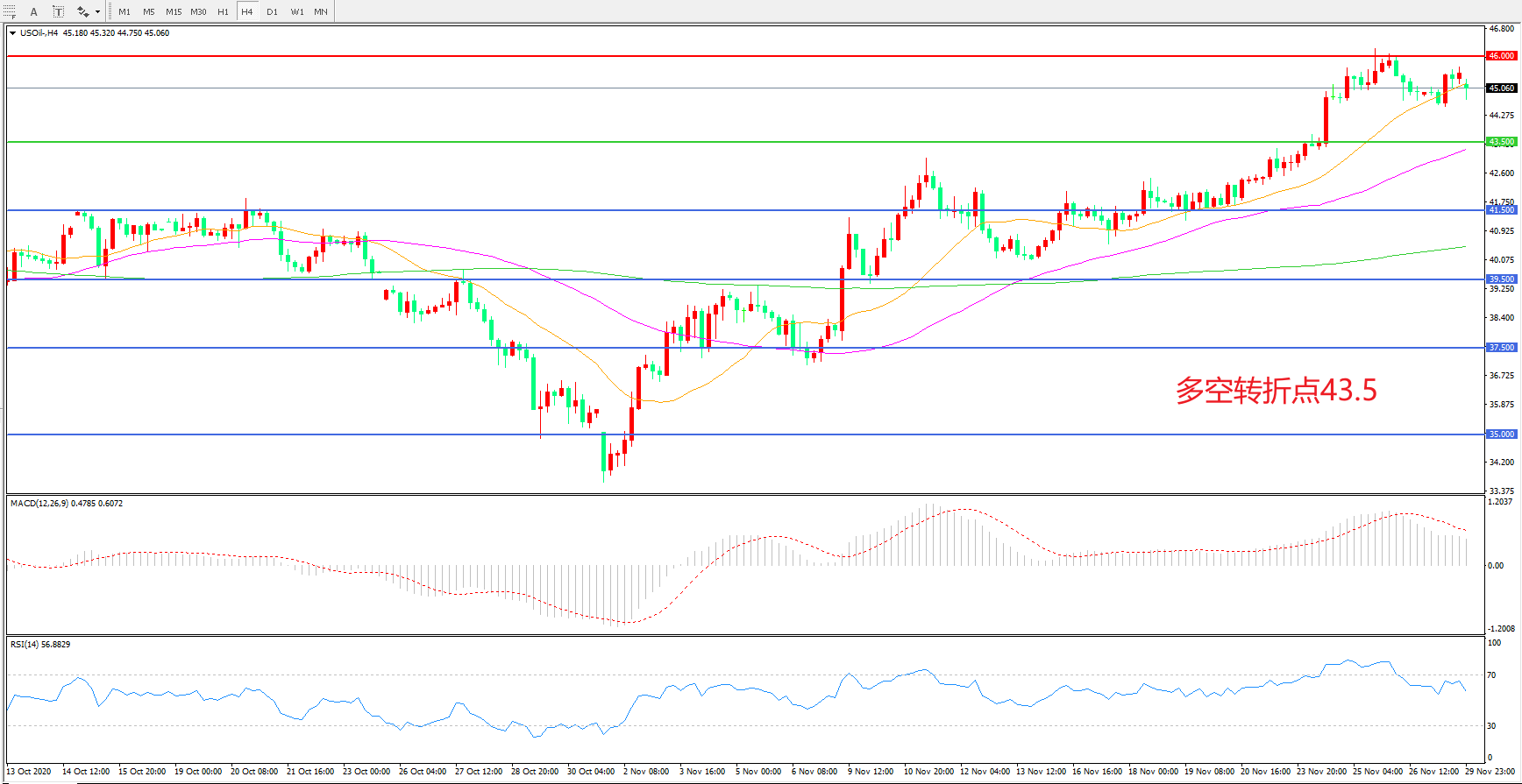 4小时图看,油价震荡上行,整体表现较为强势,21周期均线成为短期支撑,46美元成为中期阻力,MACD红柱减少,RSI指标走平,日内延续震荡概率较大。