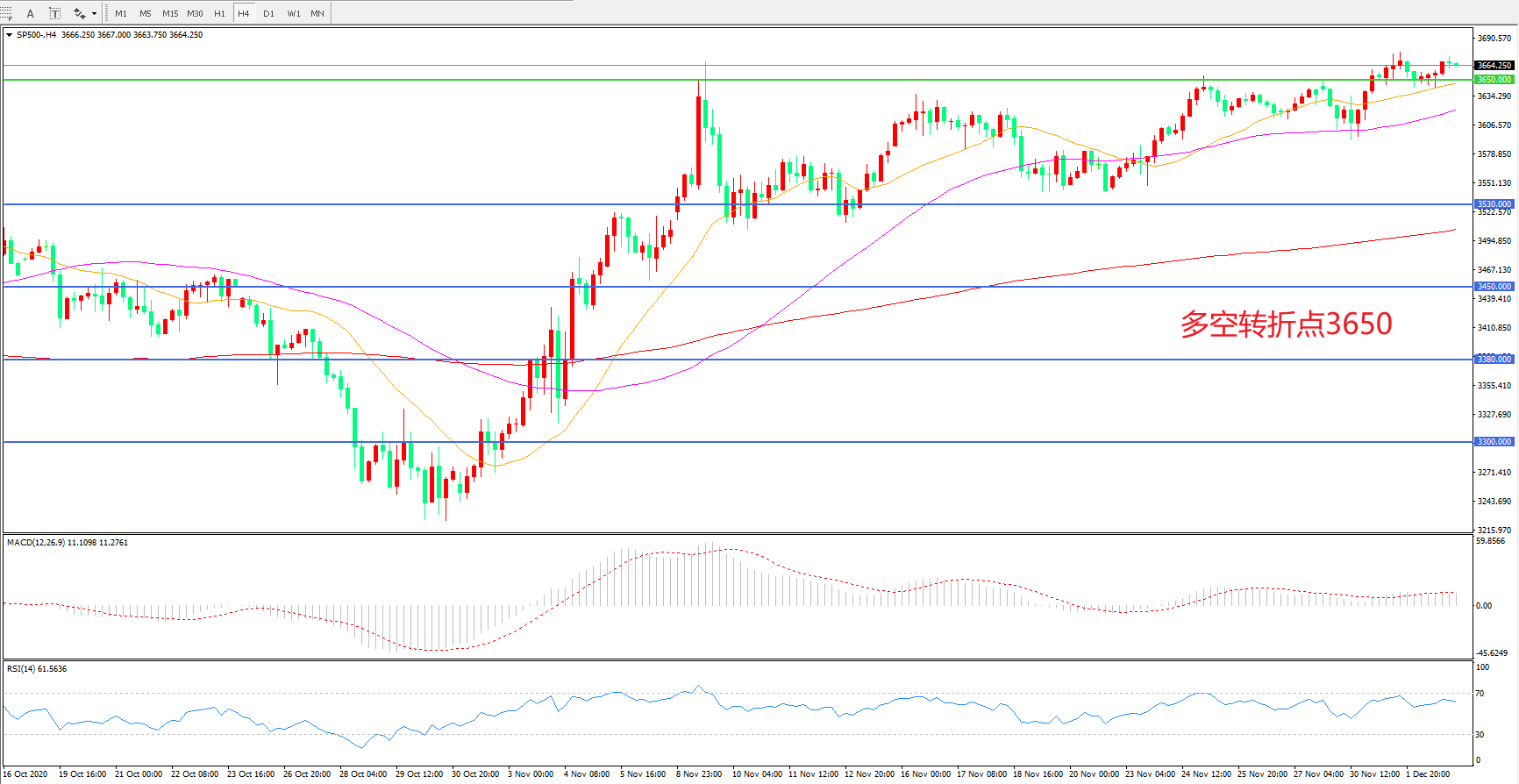 4小时图看,标普500震荡突破,上行趋势稳健,3650成为短期多空分水岭21周期均线成为短期支撑 MACD红柱增加,RSI指标向上,日内延续上行概率较大