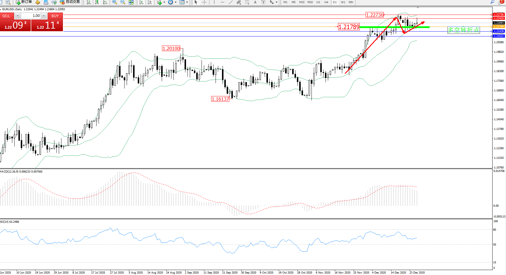交易策略:1.21789上方看涨,目标1.22420、1.22736