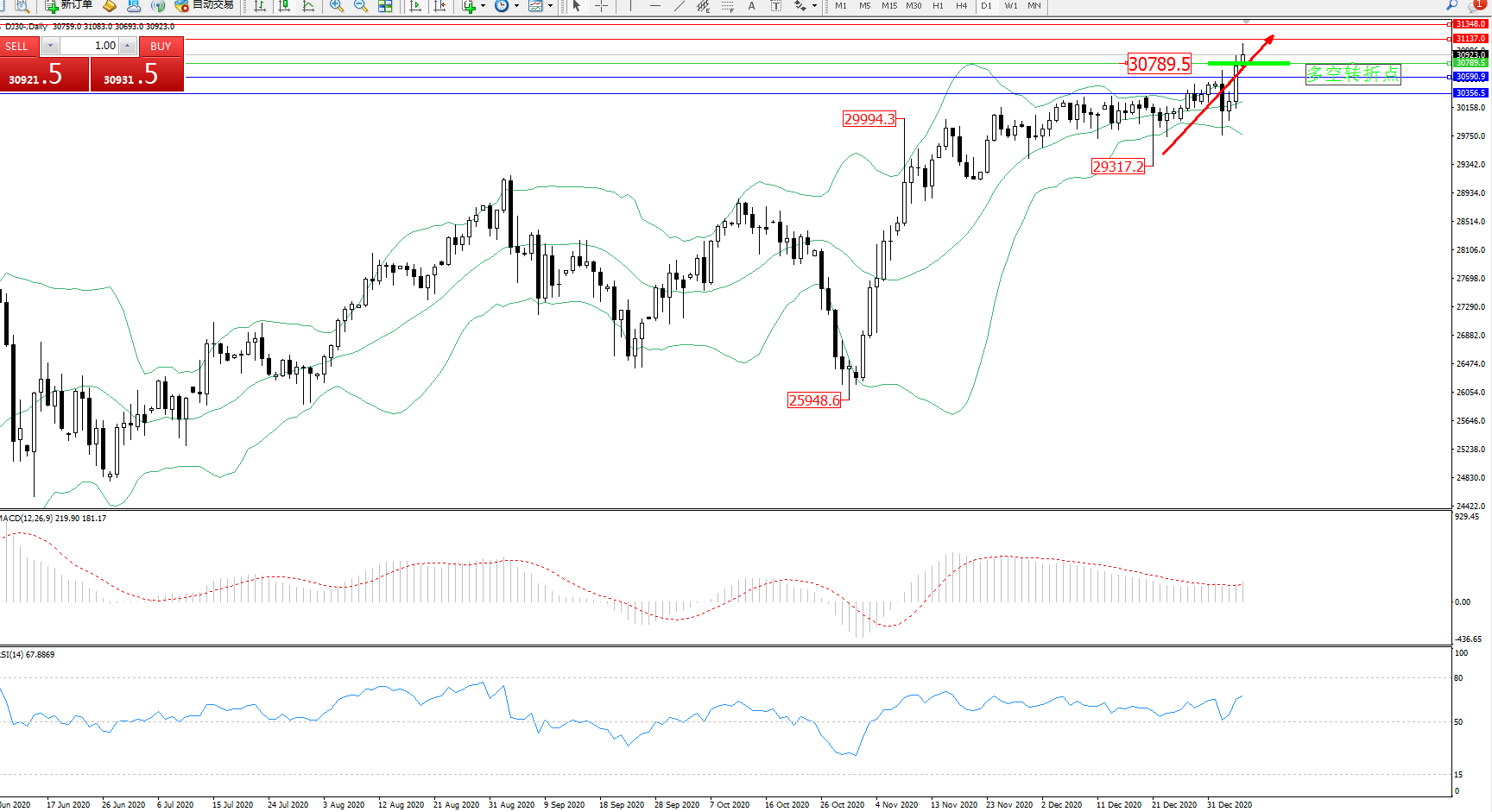 道琼斯指数1月7日(周四)收盘上涨211.70点,涨幅0.69%,报31041.13点。美股三大股指收盘齐创新高,投资者坚定聚焦于进一步财政刺激的前景,以及拜登上台后局势稳定的可能性。银行股重新获得投资者青睐,受益于对财政刺激、基础设施建设支出、利率上升和更大资本回报的乐观情绪。美国12月ISM非制造业PMI录得57.2,创去年9月以来新高;12月ISM非制造业就业指数录得48.2,创去年8月以来新低,对美联储而言,负利率并非很好的选项。随着美国经济的复苏,预计长期利率将上扬。美国经济形势好于预期。达拉斯联储主席卡普兰:美联储不应当干预美债收益率的上涨,预计美债收益率将会上扬,毕竟经济前景会得到改善;预计美国GDP大约将在2021年增长4.5%-5.0%。美联储埃文斯重申今年美国GDP将增长4%的观点,预计到2021年底失业率将为约5%。预计利率只会在2024年开始上升。一旦通胀超过目标,就可以开始温和加息。