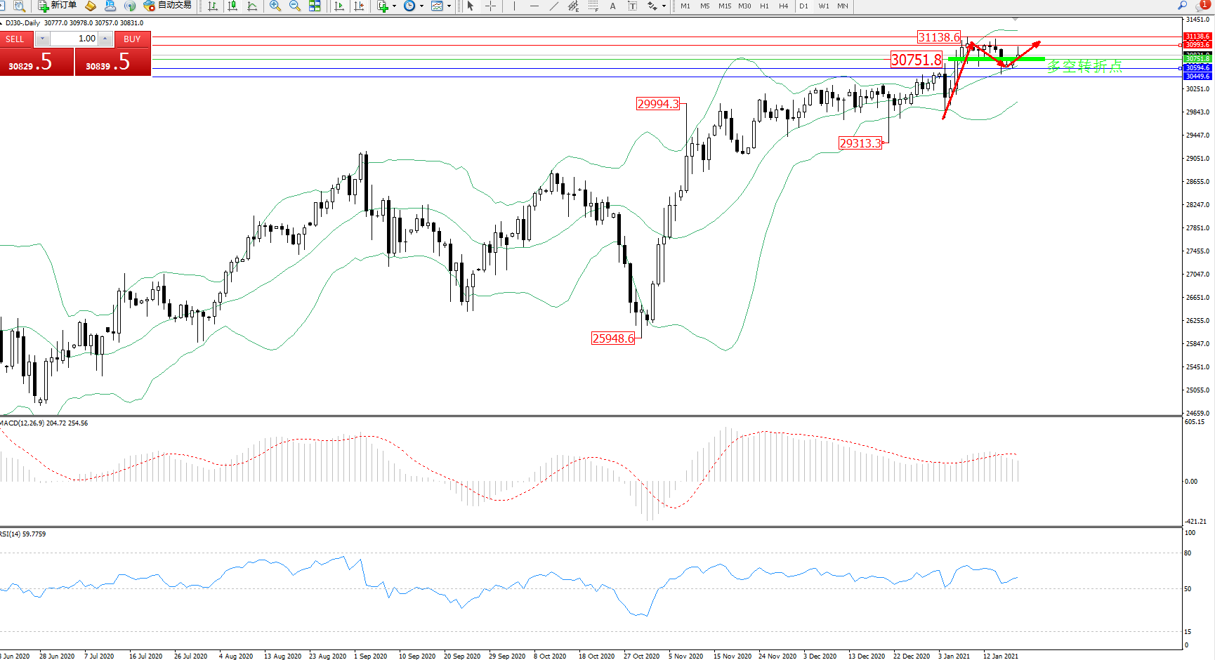 技术点评:多头动力延续布林带指标通道中上轨区间持续震荡上扬态势良好,高位抵达31138位置节点后遇阻开始短暂整理平移,触及中轨附近后再度向上移动,布林带指标呈张口走势后缓慢向上收口中,多头动力有继续向上移动走势,MACD指标处于0轴线上方多头区域维持整理平移中,RSI指标处于50均衡线上方多头区域持续弱势震荡中;