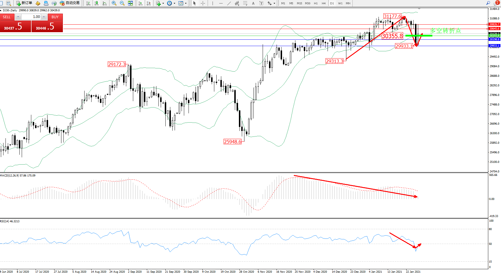 技术点评:多头动力延续布林带指标通道中上轨区间持续震荡上扬至31177位置后遇阻出现回撤下行,抵达29933位置节点后出现短暂巨震回升上行,纠结于布林带指标通道下轨附近节点,布林带指标呈收口走势后有缓慢张口迹象,MACD指标处于多头区域持续震荡下行至0轴线附近徘徊,RSI指标处于多头区域持续震荡下行至50均衡线下方维持震荡中;
