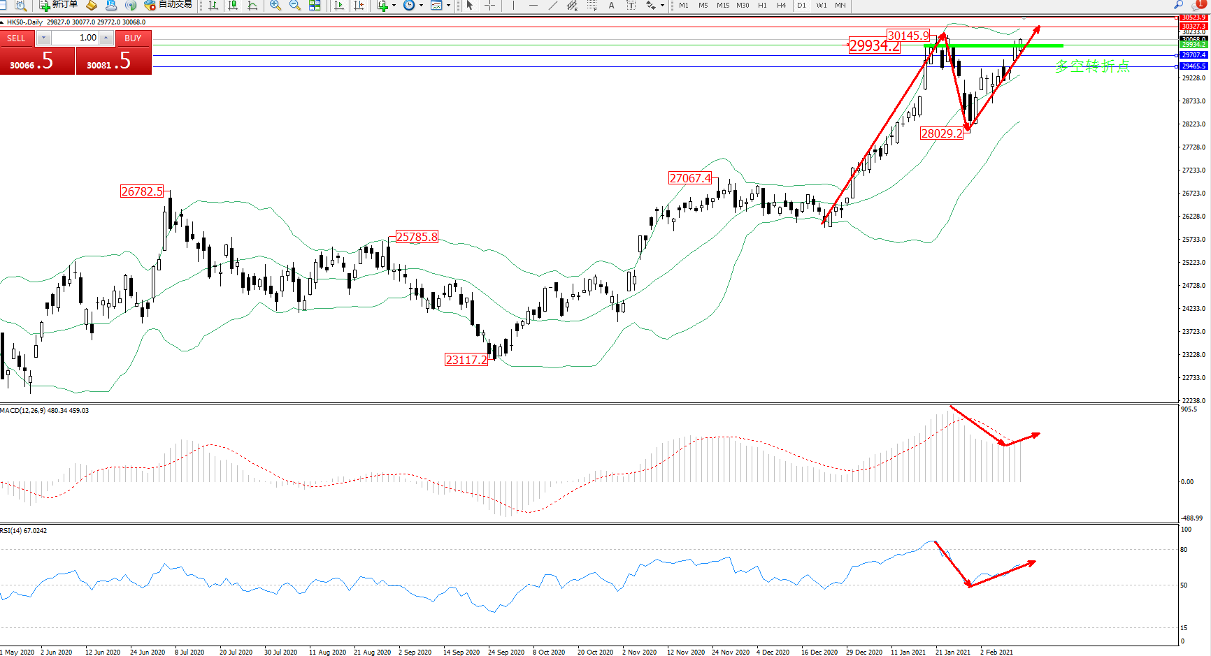 技术点评:多头多空延续布林带指标通道中上轨区间持续震荡上扬态势良好,前期高位30145位置节点近在咫尺破位在即,且有进一步向上一移动态势,布林带指标呈收口走势持续中,关注中上轨区间节点,MACD指标处于多头区域维持整理有上扬态势,RSI指标处于50均衡线上方多头区域维持整理平缓向上移动中;