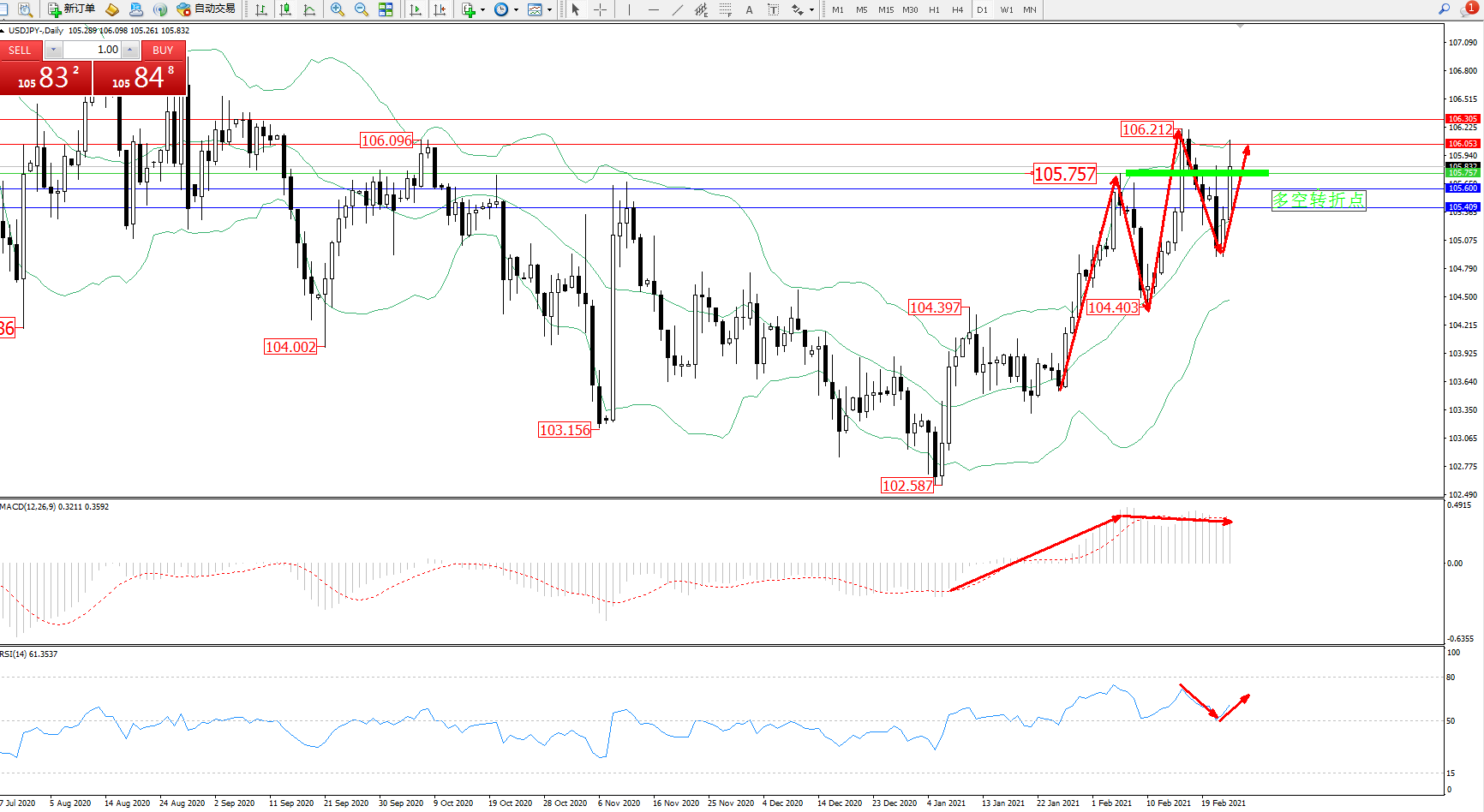 美元兑日圆处于105.841附近震荡,美联储主席鲍威尔讲话令美元指数承压的大背景下逆势反弹,因投资者对全球疫情进一步消退、经济加速复苏预期的押注进一步发酵,令避险系货币首当其冲,而美债收益率的持续坚挺也令日元汇价饱受竞争性冲击摧残。周三日内,美元兑日元录得续升,日本疫苗注射进度滞后于美英等国的大局,将令日元后市承压的趋势持续,而隔夜以来的反弹也进一步巩固了美元兑日元年初见底以来的波段式上行措施,强力的中期上行趋势通道已经形成,并反转了去年3月至今年1月的下行趋势。