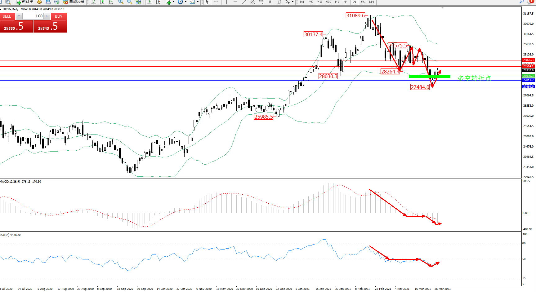 技术点评:空头动力延续布林带指标探通道中下轨区间持续震荡下行,跌破下轨抵达27484位置后得到支撑开始反转上移,多头动力有伺机入场态势,布林带指标呈张口走势后开始有收口迹象,关注下轨附近节点,MACD指标空头动力维持震荡缓慢下行至0轴线下方空头区域不断下行,RSI指标处于50均衡线下方维持窄幅整理中;