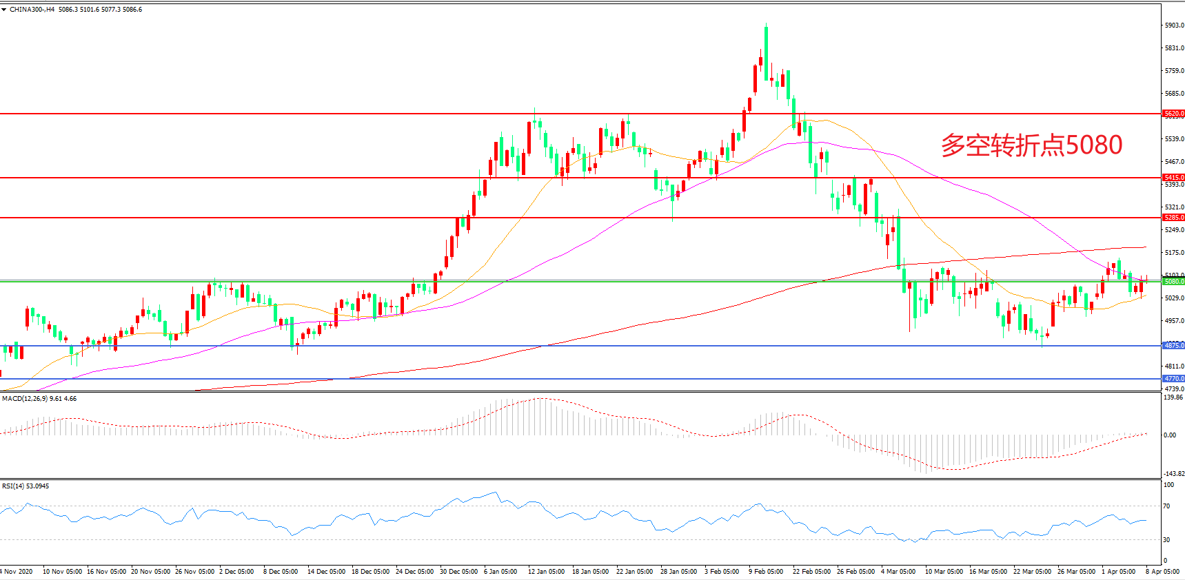 4小时图看,沪深300延续窄幅震荡,整体波幅不大,5080成为多空分水岭,21周期均线形成下方支撑,200周期均线成为上方阻力,MACD绿柱缩短,RSI指标向上,日内震荡上行概率较大。