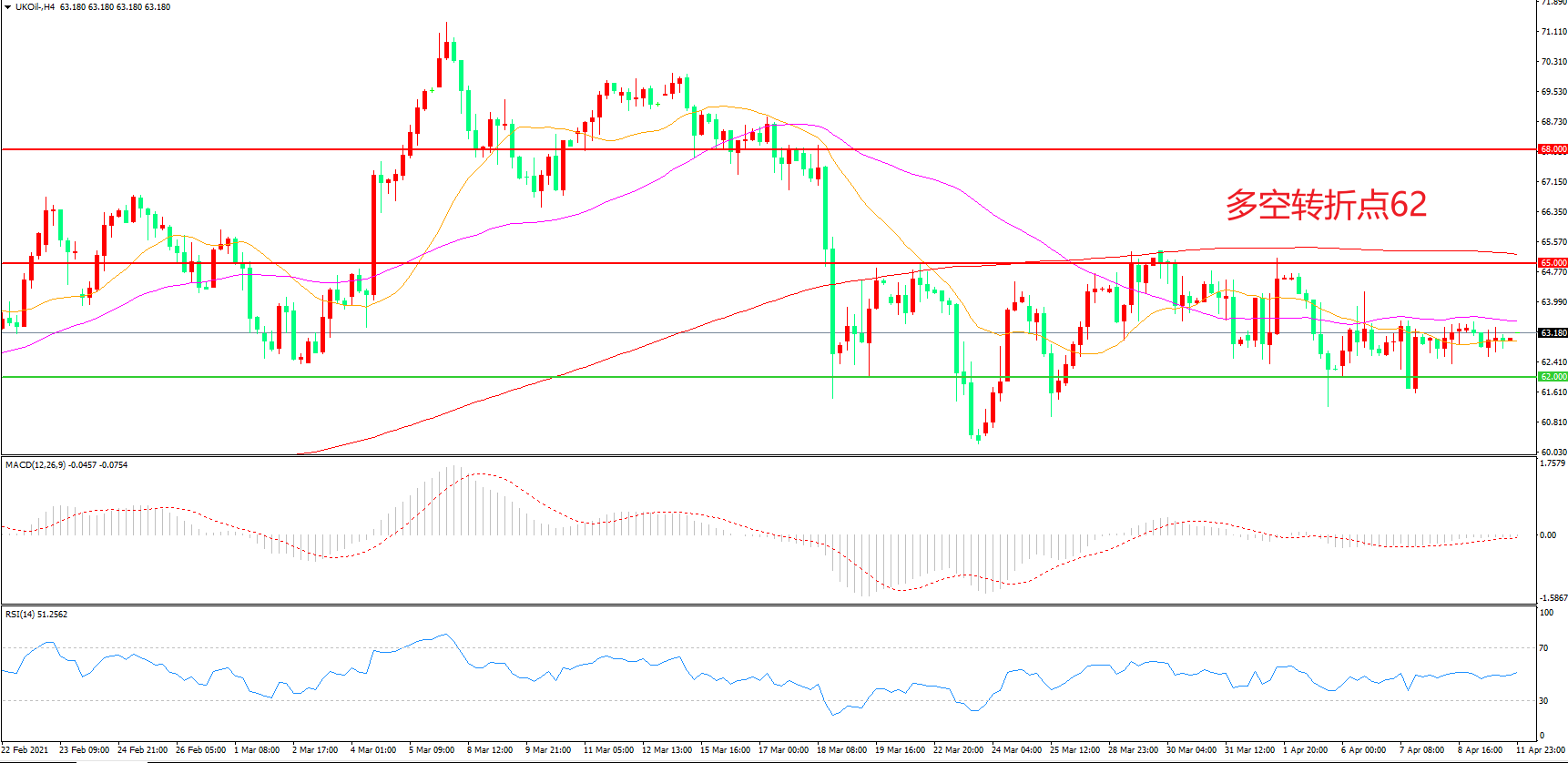 4小时图看,油价先涨后跌,区间震荡迹象明显,反弹高点逐渐减低,62美元成为短期支撑,MACD红柱增加,RSI指标走平,日内延续震荡概率较大。