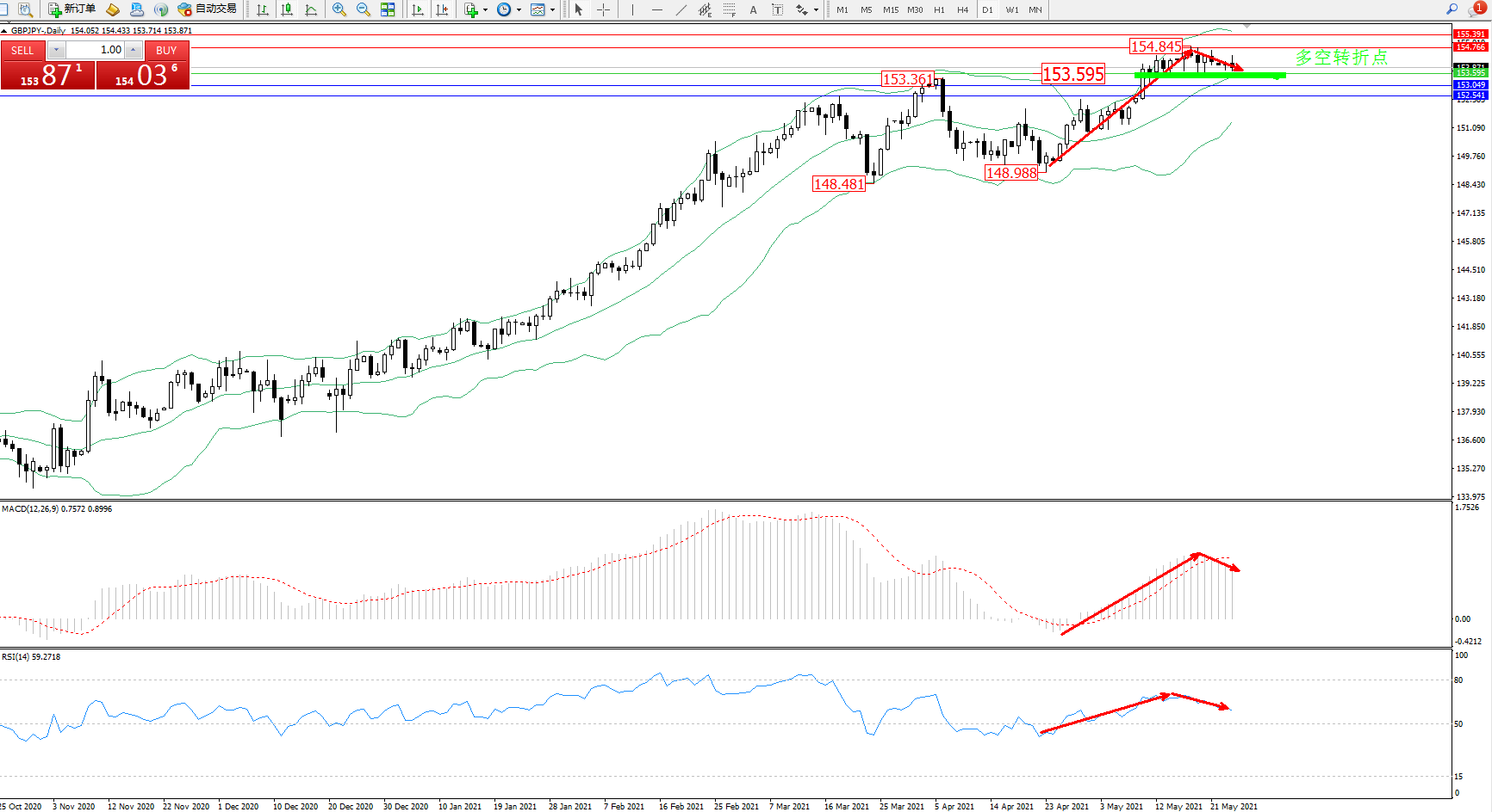 技术点评:多头动力延续布林带指标通道中上轨区间持续震荡上移,高位抵达154.845位置附近遇阻整理回撤,即将触及中轨附近节点,布林带指标呈张口走势后有短暂收口迹象,MACD指标处于多头区域弱势整理徘徊有下移迹象,,RSI指标处于多头区域高位平缓下移中;
