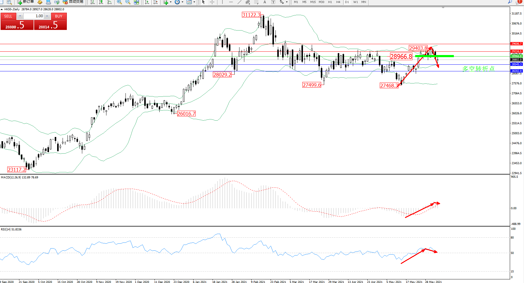 技术点评:低位多头动力持续震荡上扬至布林带指标上轨29403附近遇阻整理,短期徘徊后空头动力伺机入场反转下行,布林带指标呈缓慢张口走势持续中,短期空头或有进一步调整下行迹象,MACD指标处于0轴线上方多头区域维持整理徘徊,RSI指标处于50均衡线上方多头区域维持窄幅震荡后有下行迹象;