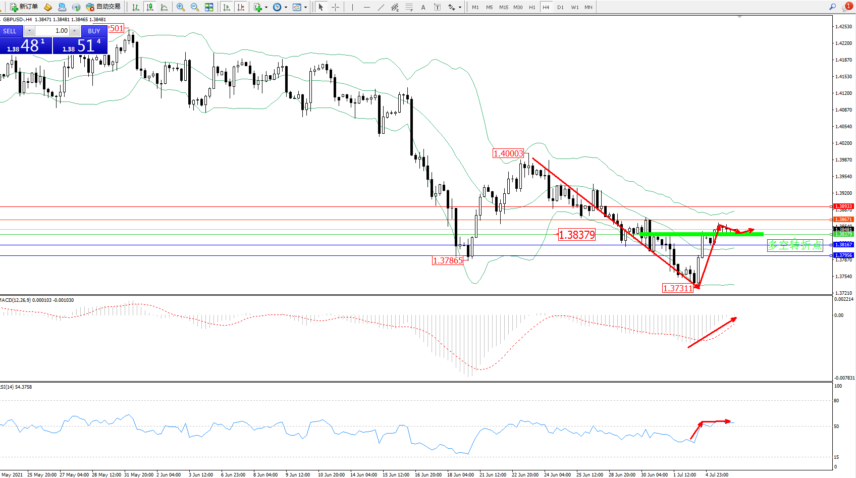 交易策略:1.38379上方看涨,目标1.38671、1.38933