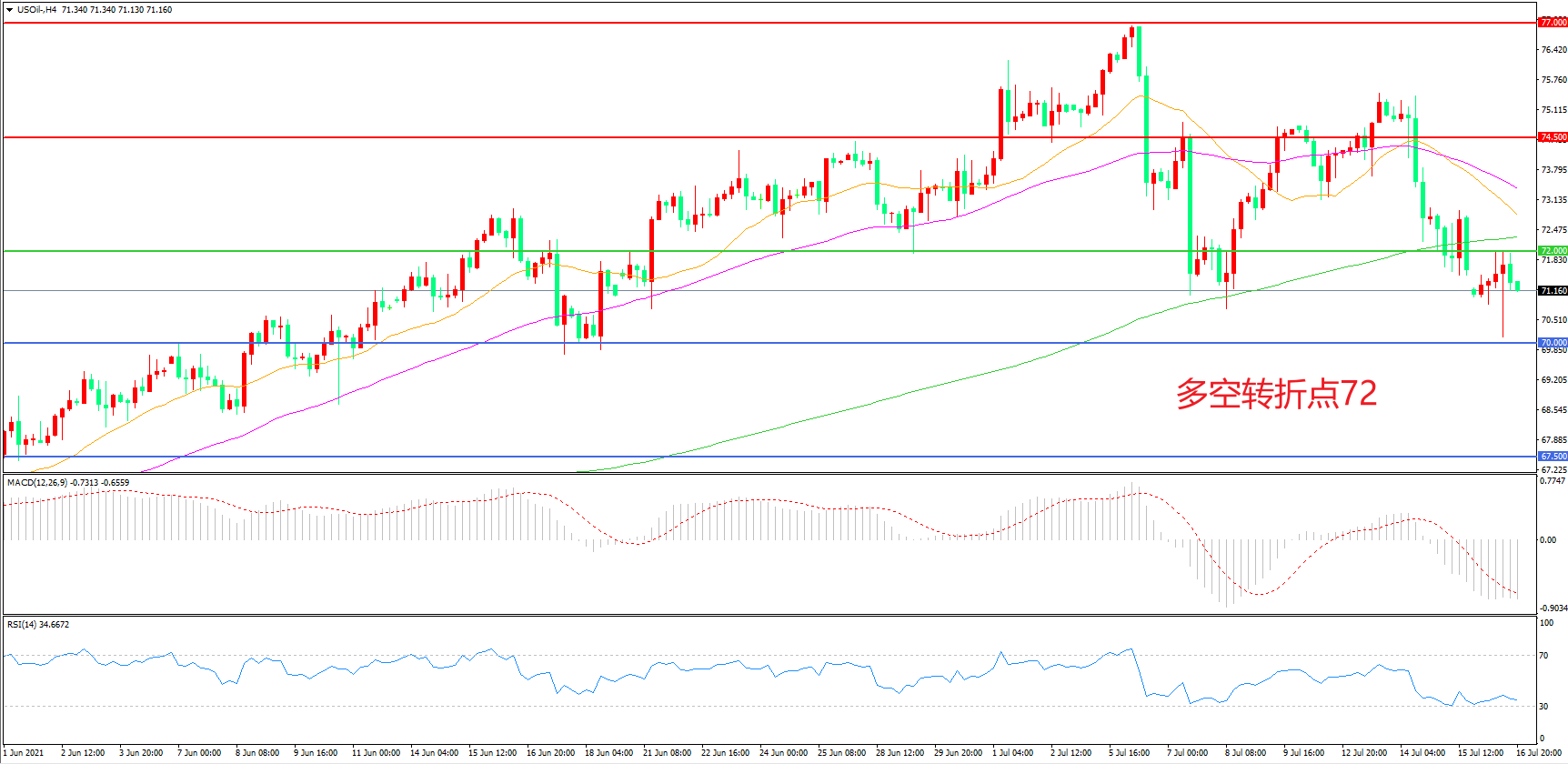 上周,原油市场振荡下行,多空博弈在开始短暂分出胜负,多头在空头强有力的炮火之下开始撤退,原油价格在高位呈现弱势,美国WTI原油连续下行,收报71.16美元/桶。7月18日晚间,OPEC会议顺利落幕并发表声明,为后续完全解除减产协议划定了路线图。 据最新安排,从8月起整体产能将每月增加40万桶/日,逐步增加的原油供应将在供需上对油价形成打压。