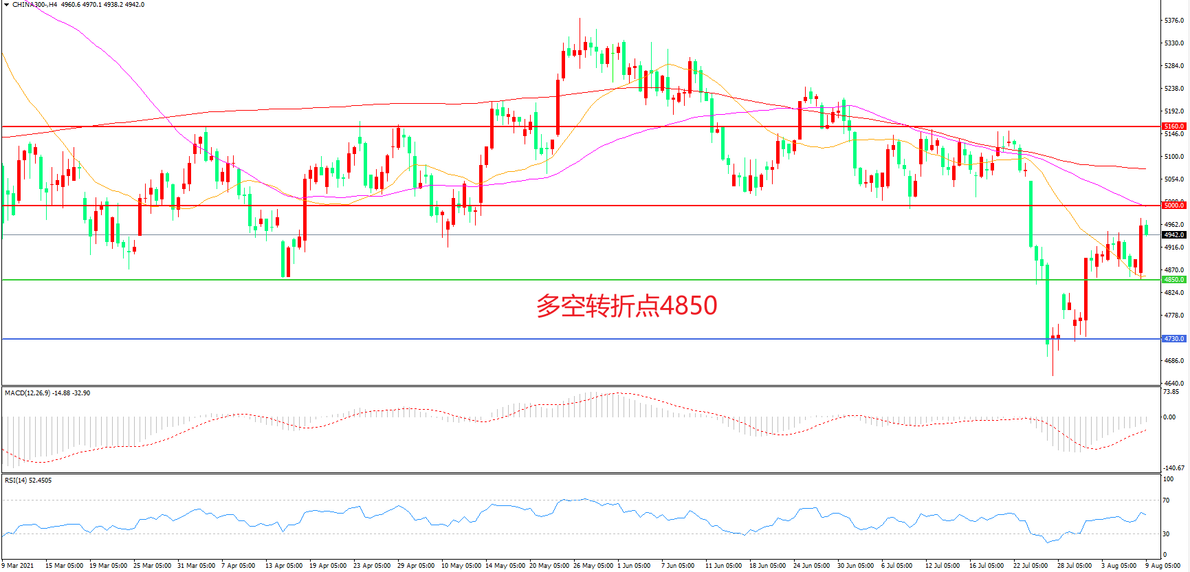 4小时图看,沪深300以4850为依托大幅反弹,短线行情回暖,5000点成为上方阻力,MACD绿柱减少,RSI指标走平,日内震荡上行概率较大。