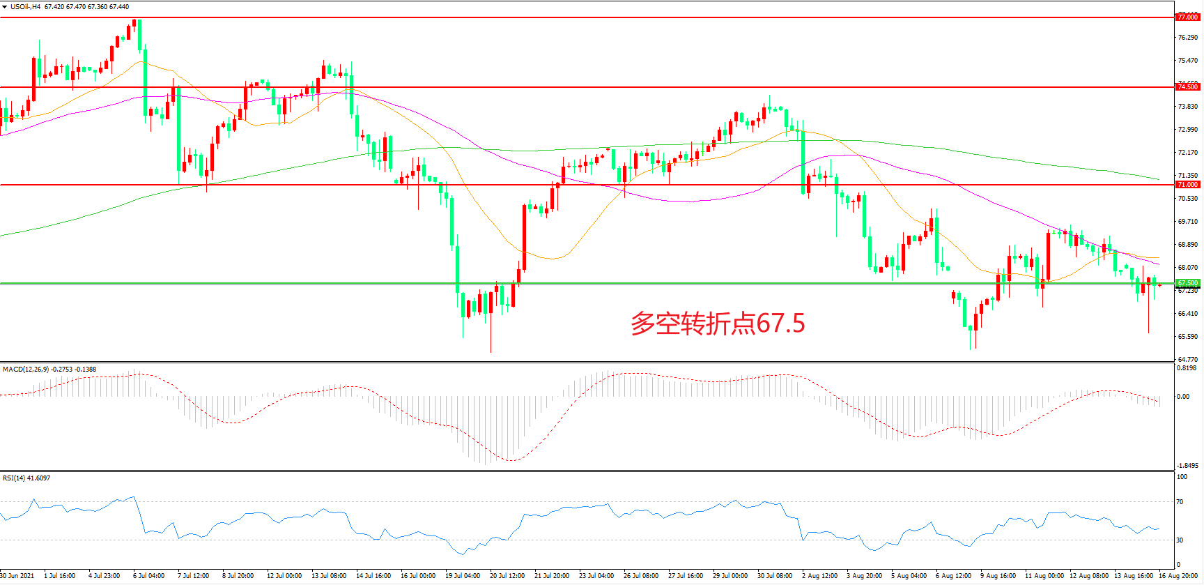 4小时图看,油价短线反弹后受制于55周期均线,67.5成为多空分水岭,短线行情较为低迷,MACD绿柱增加,RSI指标走平,油价震荡下行概率较大。