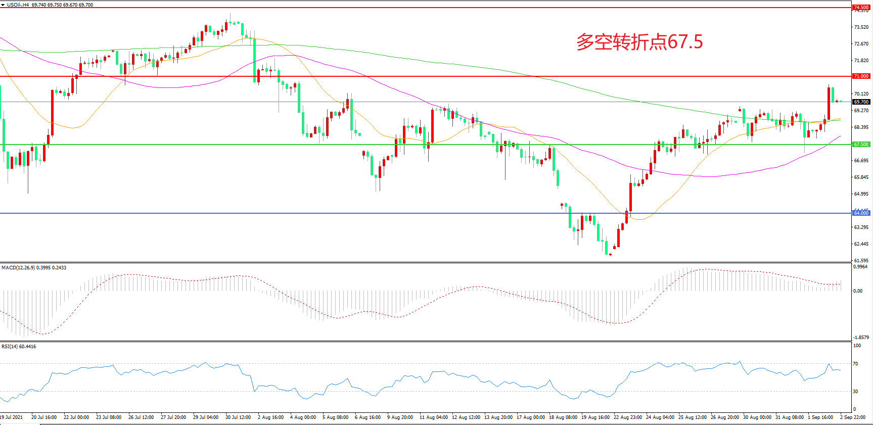 周四(9月2日),美国在遭遇飓风之后美国的海上钻井平台的恢复并没有想象中的那么快,墨西哥湾地区仍有150万桶的原油生产设施处于停产状态,乐观情绪推动油价继续反弹,美国WTI原油强势拉升,收报69.72美元/桶。过去一周原油价格从低位持续反弹了超过10%,这其中已经有一部分飓风影响预期反映在了价格中,投资者追涨时要时刻注意防范风险。