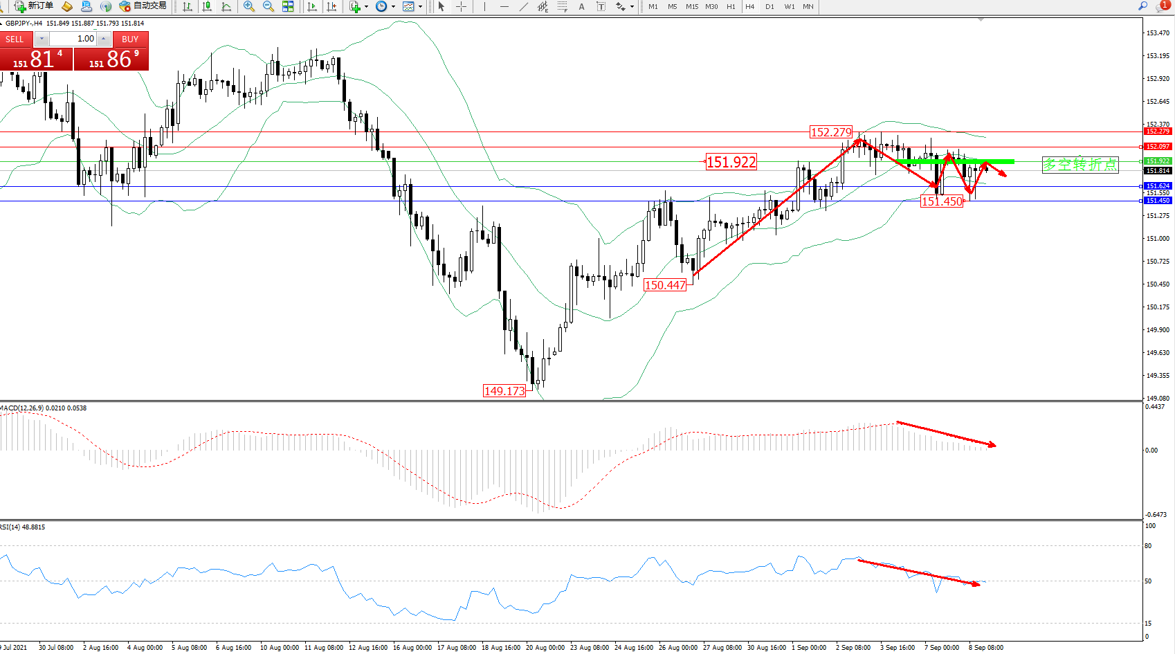 技术点评:多头动力延续布林带指标通道中上轨区间持续震荡上扬,高位抵达152.279位置后遇阻回撤,纠结于中下轨区间窄幅整理中,短期或维持震荡下行走势,布林带指标呈收口走势后开始缓慢下行,MACD指标处于多头区域维持弱势整理缓慢下移至0轴线附近徘徊,RSI指标处于50均衡线附近弱势整理中;