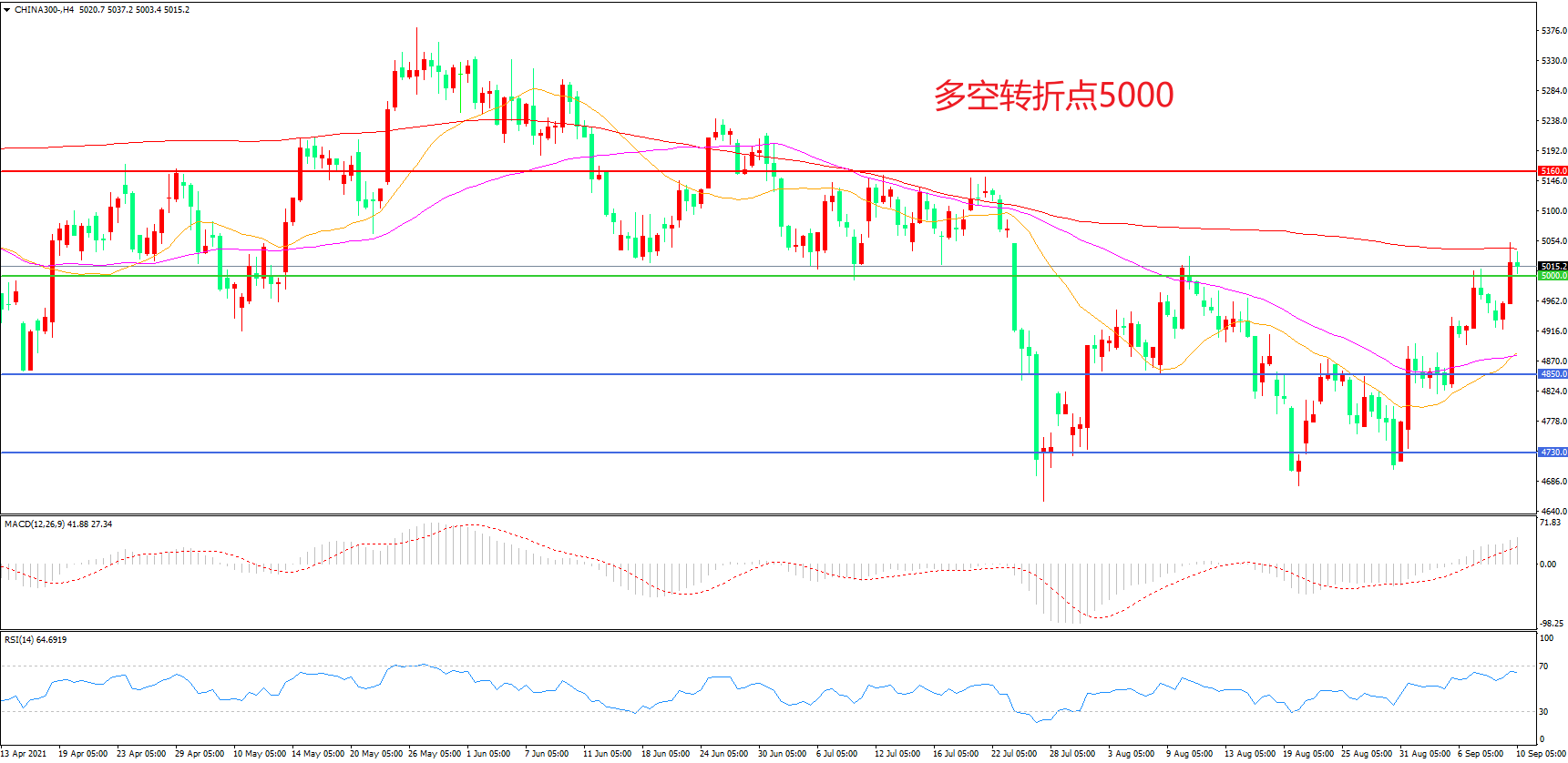 4小时图看,沪深300连续上行后突破5000短资源库,短期走势偏强,短期均线形成金叉,200周期均线成为上方阻力,MACD红柱增加,RSI指标走平,日内震荡上行概率较大。
