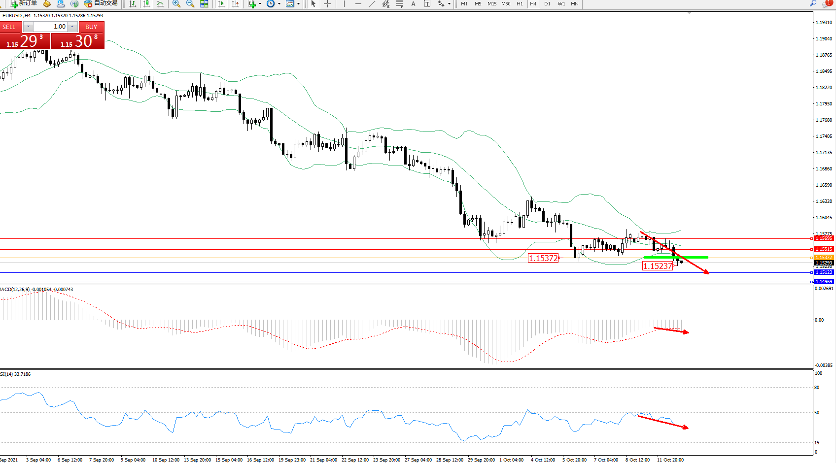 交易策略:1.15372下方看跌,目标1.15123、1.14969