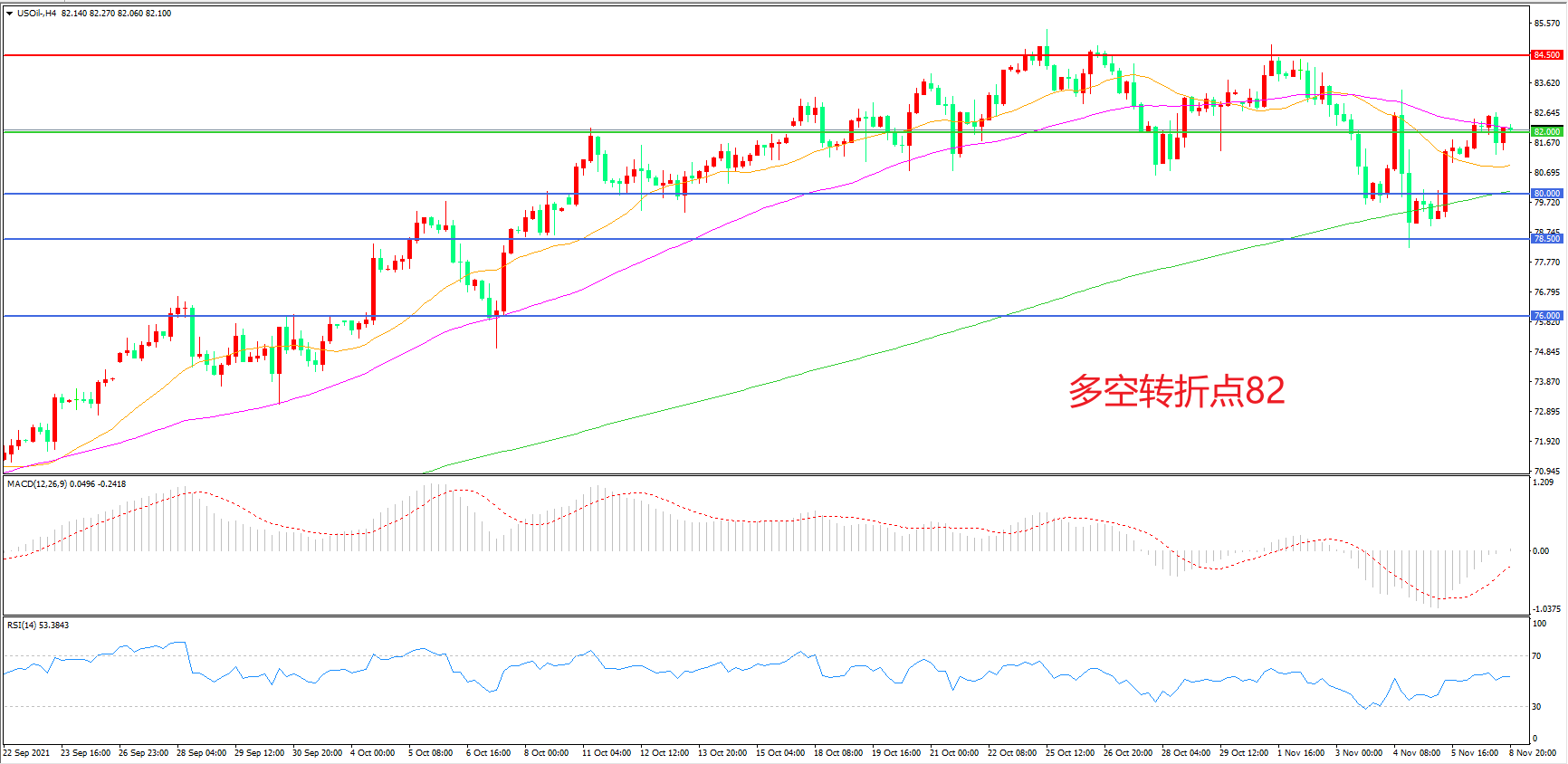 4小时图看,油价围绕82美元窄幅震荡,多空博弈逐渐激烈,80美元成为短期支撑,84.5成为中期阻力,MACD绿柱缩短,RSI指标走平,日内延续震荡概率较大。