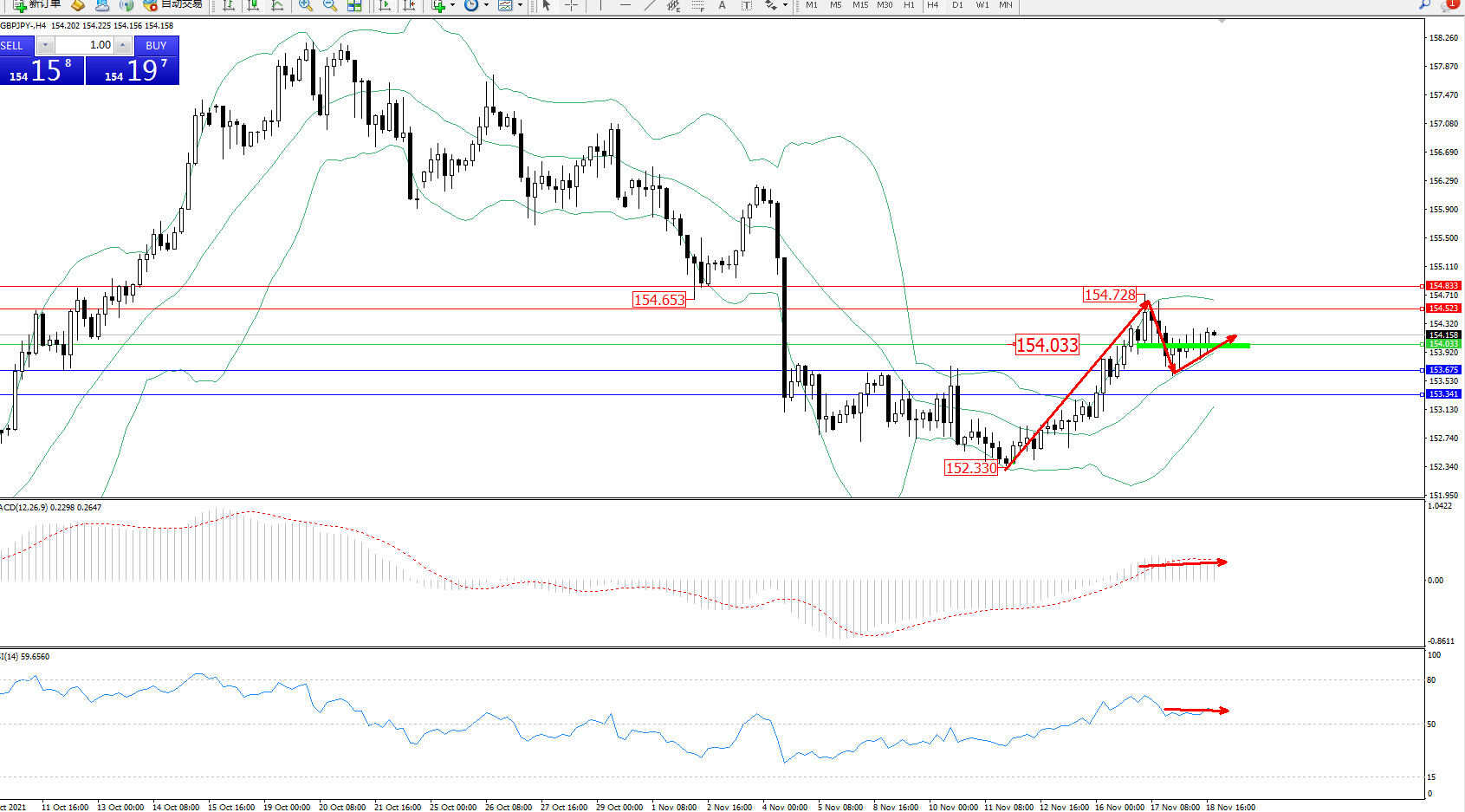 交易策略:154.033上方看涨,目标154.523、154.833