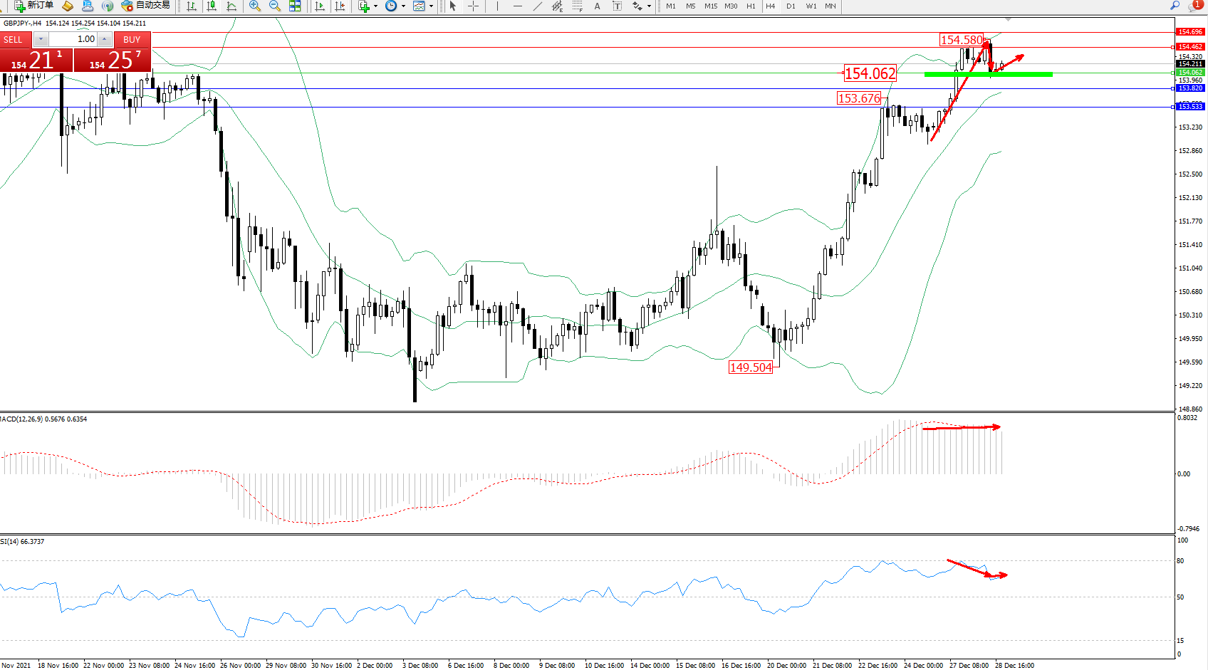 技术点评:多头动力延续布林带指标通道中上轨区间持续震荡上扬,高位抵达154.580附近节点有短期遇阻回撤,维持高位整理中,布林带指标呈上行趋势走势态势良好,高位有继续攀升态势,MACD指标维持高位整理平移,RSI指标处于高位震荡后开始回撤徘徊;