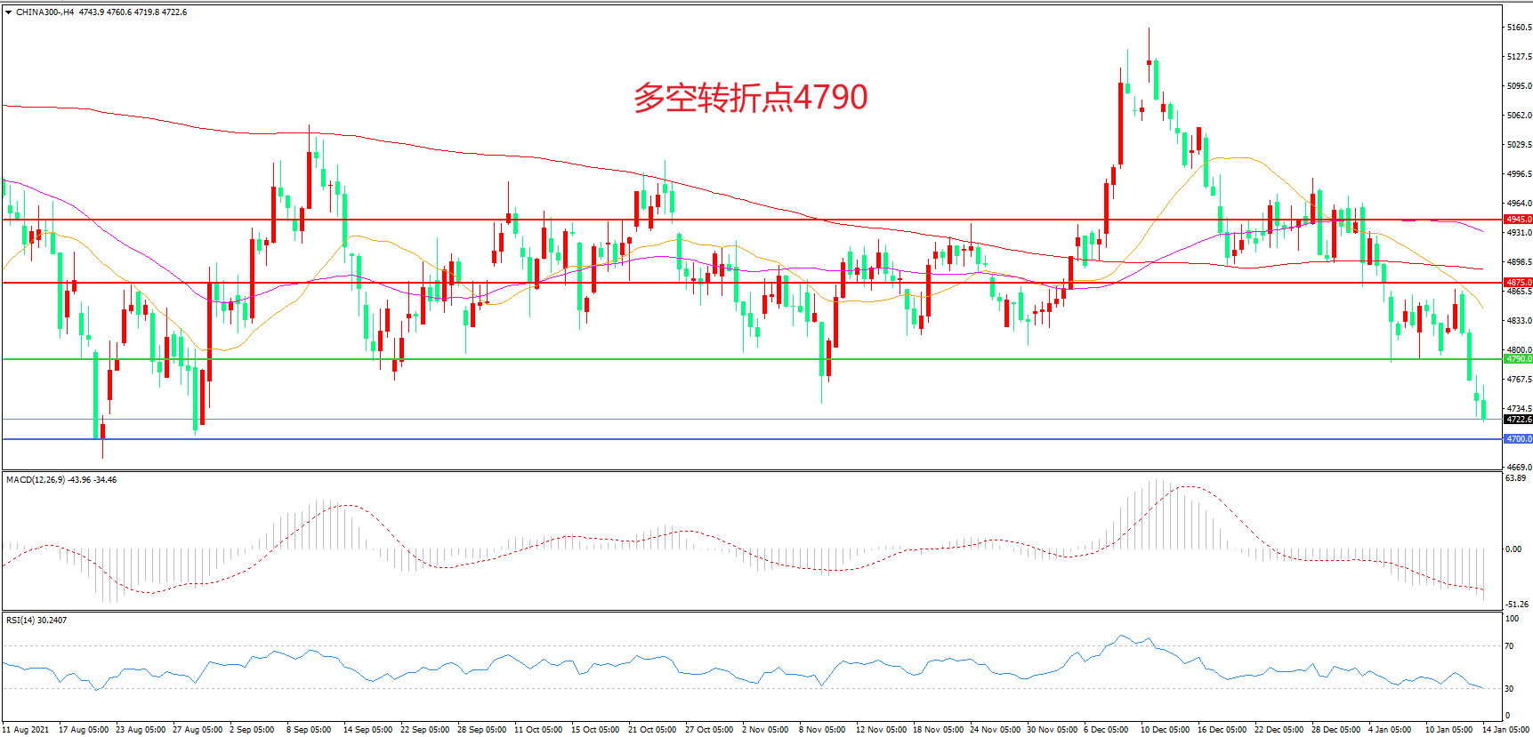 4小时图看,沪深300低开低走,跌破前期整理区间,整体表现较弱,均线系统呈空头排列,MACD绿柱增加,RSI指标走平,日内延续下行概率较大。