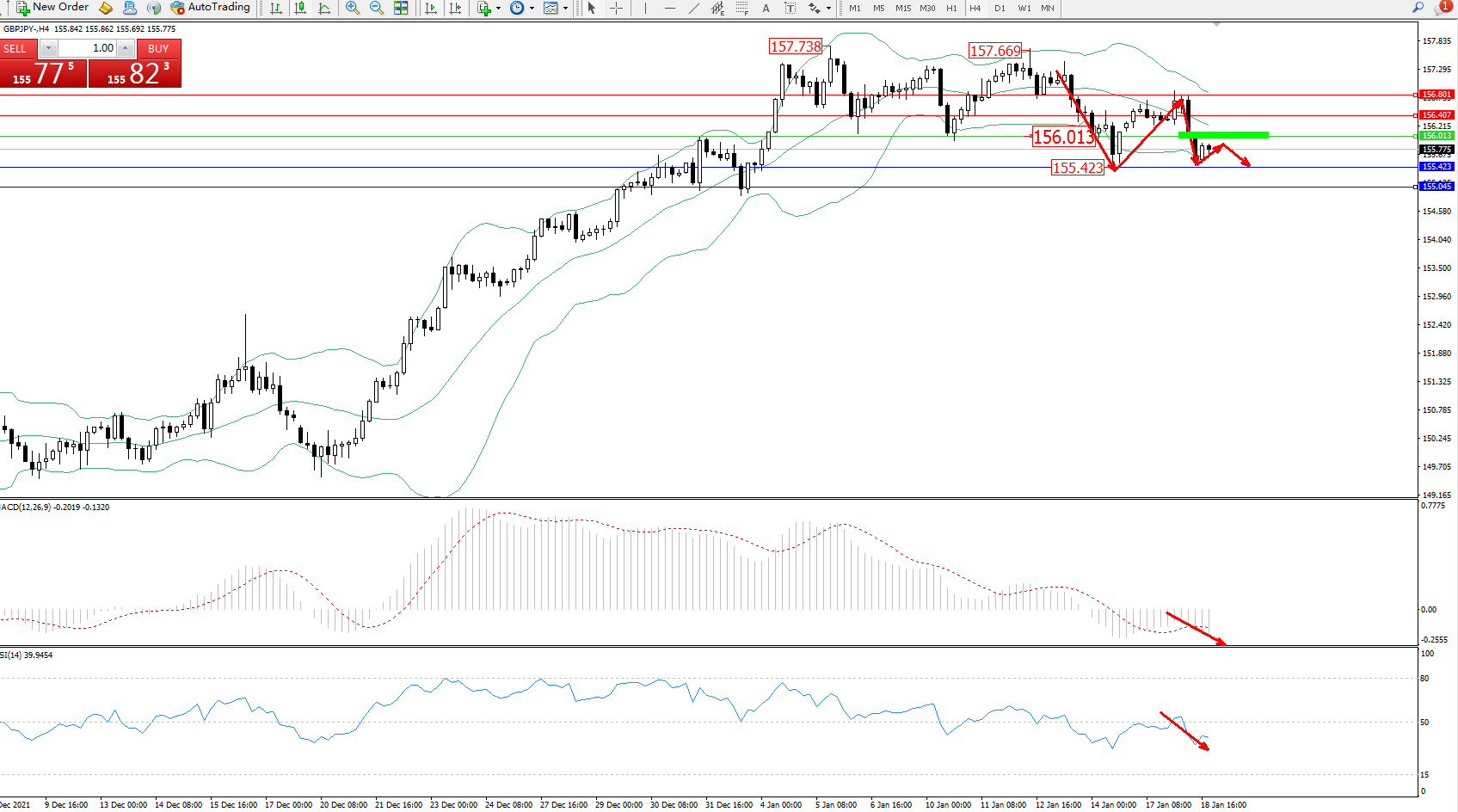 交易策略:156.013下方看跌,目标155.423、155.045