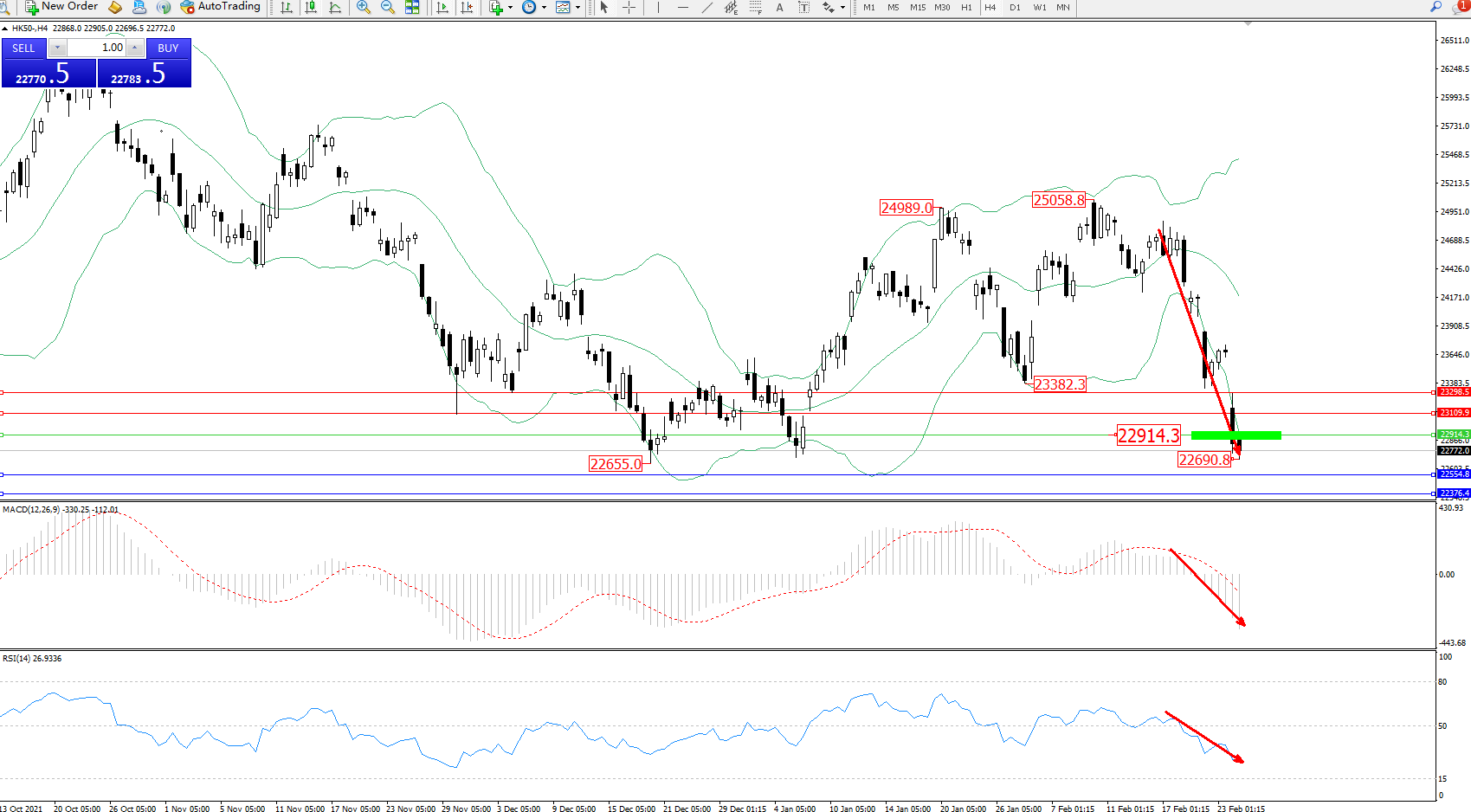 香港恒生指数2月24日(周四)收盘下跌758.72点,跌幅3.21%,报22901.56点;俄罗斯宣布正式向乌克兰进攻,俄乌紧张局势进一步加剧,全球金融市场闻声大跌。恒生科技指数更是大跌4.33%续刷历史低位。权重科技股领跌大市,阿里巴巴跌6.67%,快手、百度、小米跌超5%,腾讯、美团跌近4%;因避险影响,黄金股、石油股逆势上涨,联合国秘书长古特雷斯当地时间23日晚呼吁俄罗斯将军队撤回,强调“这场冲突必须立即停止”。古特雷斯是在安理会审议乌克兰问题紧急会议结束并得知俄罗斯总统普京宣布决定在顿巴斯地区发动特别军事行动后做上述表态的。