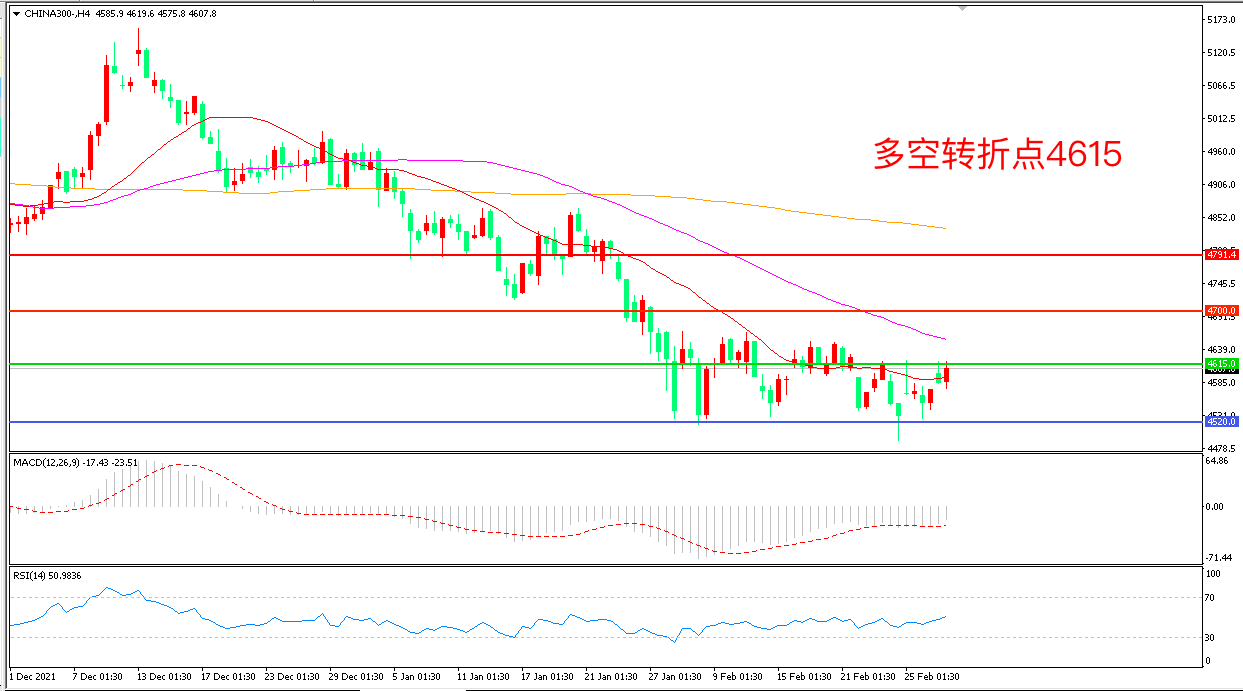 4小时图看,沪深300 区间震荡迹象明显,4615成为上方阻力,4520成为下方支撑, MACD绿柱增加,RSI指标走平,日内延续震荡概率较大。