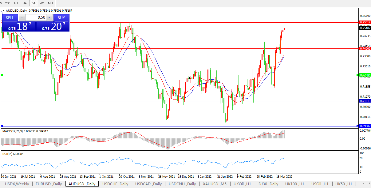 技术面简析:日图均线呈多头排列,汇价快速拉升,MACD运行于0轴上且量能小幅放量,RSI延续走高,预计汇价大概率将进一步上行。