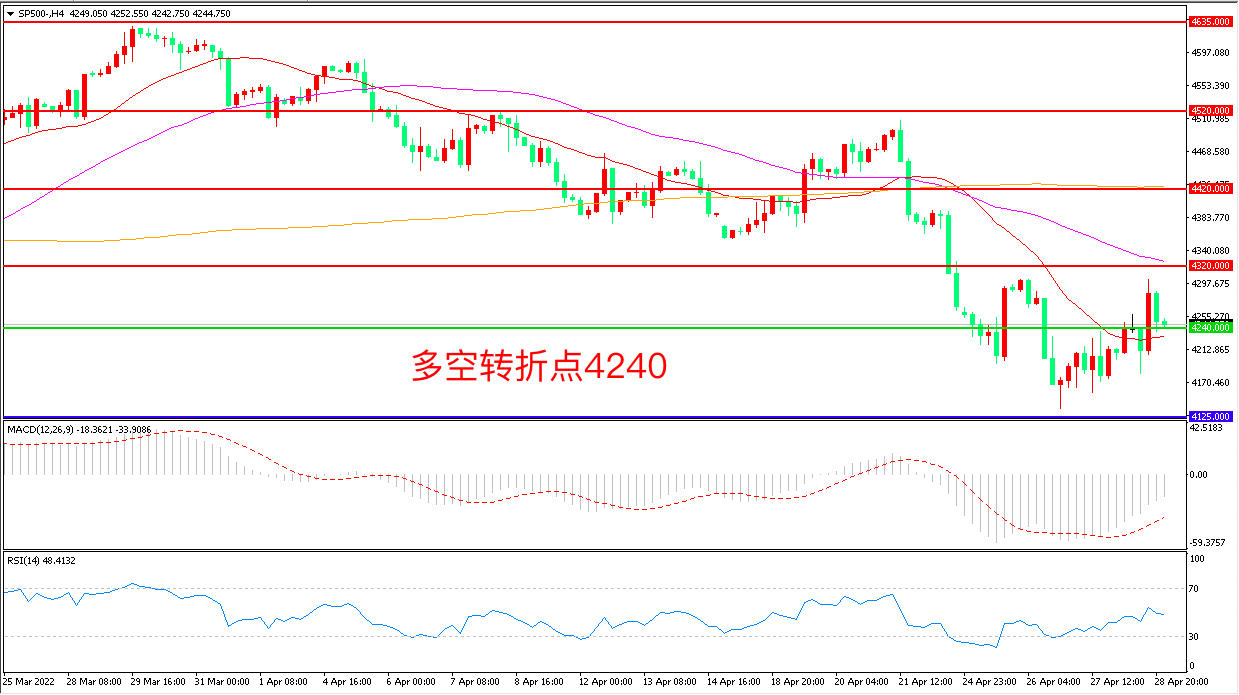周四(4月28日),苹果一季度业绩超预期增长,龙头科技股带动美股回暖,标普500冲高回落,收报4244.05点。此前在科技股的抛售潮下,欧美股市动荡不安,但部分交易员认为一季度财报季相对不错,市场信心受到提振,多空交织下,美股波幅可能再次扩大。