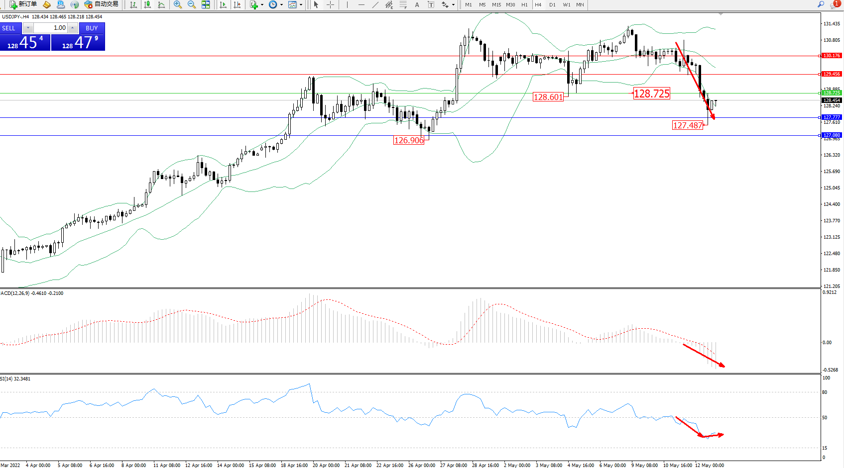技术点评:高位长时间维持布林带指标通道内窄幅震荡平移,空头动力终究伺机入场,延续布林带指标下轨附近不断震荡下行,抵达127.487附近节点后开始快速回升,布林带指标呈缓慢张口走势后开始逐渐收口,MACD指标处于0轴线下方空头区域维持震荡不断下移中,RSI指标处于空头区域维持震荡不断下行;