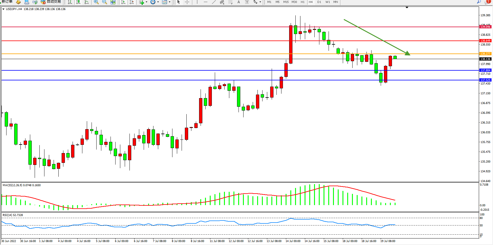 美元兑日圆维持138.143附近震荡,美联储7月加息一个100个基点可能没戏了。在强烈加息预期有可能落空的情形下,美日或会继续存在高位获利调整的行情出现。