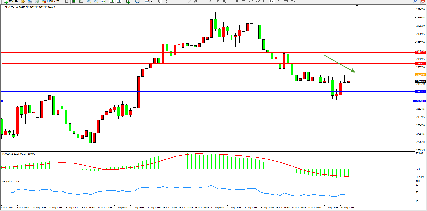 日经225指数8月24日(周三)收盘下跌123.75点,跌幅0.43%,报28329.00点。日本首相岸田文雄今日通过视频召开记者会,表示为减轻医疗机构和保健所的负担,将调整新冠疫情应对政策。日本各地方政府可自主判断,将目前报告所有新冠患者信息的做法改为只报告重症风险较高的患者,同时将考虑缩短感染者居家隔离时间。
